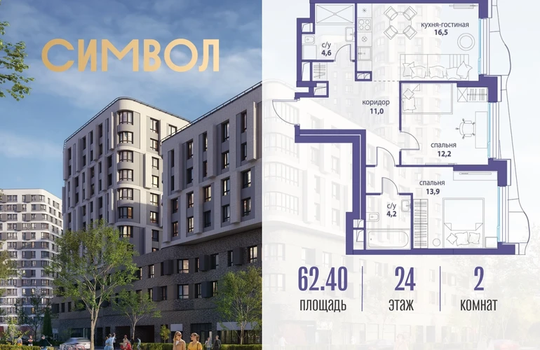 Продается 2-комнатная квартира от застройщика: общая площадь 62.40 м², жилая 26.10 м², кухня 16.50 м², 24-й этаж, жилой квартал «Вдохновение», корпус 35 (секция 1). Срок сдачи: 4 квартал 2027 года. Позвоните сейчас и забронируйте квартиру! Квартал бизнес-класса СИМВОЛ — это городское пространство нового поколения в историческом районе Лефортово, на границе ЦАО, в 2 км от Садового кольца. Бионическая архитектура СИМВОЛА превратила Лефортово в суперсовременное и модное пространство. Из окон, с балконов и террас просторных квартир СИМВОЛА открываются отличные виды на город и новый парк «Зеленая река», «протекающий» через все кварталы комплекса на 2 км. В квартале уже есть все, что нужно для комфортной жизни: кафе и рестораны, супермаркеты и магазины, медицинские и физкультурно-оздоровительные центры, салоны красоты и барбершопы, аптеки и оптики, химчистки, пункты доставки и другие сервисы — всего более 90 действующих объектов внутриквартальной инфраструктуры. Для юных жителей СИМВОЛА открыты детский сад и инженерный лицей при МГТУ им. Баумана. Особенности квартала: • Свой парк «Зеленая Река» - 10 га зелени и развлечений на любой вкус! • Уникальная для Москвы архитектура - Проект создан архитектурной мастерской ATRIUM по дизайн-коду британских бюро LDA Design и UHA London. • Богатая инфраструктура с детскими садами и лицеем им. Баумана, кафе и ресторанами, супермаркетами и аптеками, зоной для фитнеса, бассейном и мед. центром. • Квартиры с панорамными окнами, террасами, ванными с окнами и каминами редких форматов. • Закрытые безопасные зелёные дворы-парки без машин!О застройщике