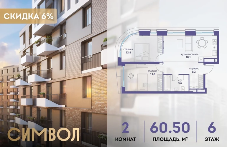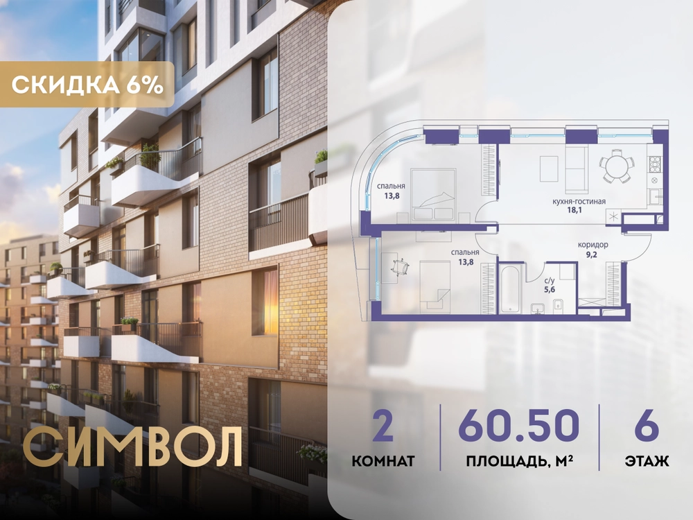 Продается 2-комнатная квартира от застройщика: общая площадь 60.50 м², жилая 27.60 м², кухня 18.10 м², 6-й этаж, жилой квартал «Вдохновение», корпус 34 (секция 1). Срок сдачи: 4 квартал 2027 года. Позвоните сейчас и забронируйте квартиру! Квартал бизнес-класса СИМВОЛ — это городское пространство нового поколения в историческом районе Лефортово, на границе ЦАО, в 2 км от Садового кольца. Бионическая архитектура СИМВОЛА превратила Лефортово в суперсовременное и модное пространство. Из окон, с балконов и террас просторных квартир СИМВОЛА открываются отличные виды на город и новый парк «Зеленая река», «протекающий» через все кварталы комплекса на 2 км. В квартале уже есть все, что нужно для комфортной жизни: кафе и рестораны, супермаркеты и магазины, медицинские и физкультурно-оздоровительные центры, салоны красоты и барбершопы, аптеки и оптики, химчистки, пункты доставки и другие сервисы — всего более 90 действующих объектов внутриквартальной инфраструктуры. Для юных жителей СИМВОЛА открыты детский сад и инженерный лицей при МГТУ им. Баумана. Особенности квартала: • Свой парк «Зеленая Река» - 10 га зелени и развлечений на любой вкус! • Уникальная для Москвы архитектура - Проект создан архитектурной мастерской ATRIUM по дизайн-коду британских бюро LDA Design и UHA London. • Богатая инфраструктура с детскими садами и лицеем им. Баумана, кафе и ресторанами, супермаркетами и аптеками, зоной для фитнеса, бассейном и мед. центром. • Квартиры с панорамными окнами, террасами, ванными с окнами и каминами редких форматов. • Закрытые безопасные зелёные дворы-парки без машин!О застройщике