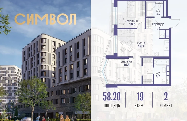 Продается 2-комнатная квартира от застройщика: общая площадь 58.20 м², жилая 27.40 м², кухня 19.20 м², 19-й этаж, жилой квартал «Вдохновение», корпус 33 (секция 3). Срок сдачи: 4 квартал 2027 года. Позвоните сейчас и забронируйте квартиру! Квартал бизнес-класса СИМВОЛ — это городское пространство нового поколения в историческом районе Лефортово, на границе ЦАО, в 2 км от Садового кольца. Бионическая архитектура СИМВОЛА превратила Лефортово в суперсовременное и модное пространство. Из окон, с балконов и террас просторных квартир СИМВОЛА открываются отличные виды на город и новый парк «Зеленая река», «протекающий» через все кварталы комплекса на 2 км. В квартале уже есть все, что нужно для комфортной жизни: кафе и рестораны, супермаркеты и магазины, медицинские и физкультурно-оздоровительные центры, салоны красоты и барбершопы, аптеки и оптики, химчистки, пункты доставки и другие сервисы — всего более 90 действующих объектов внутриквартальной инфраструктуры. Для юных жителей СИМВОЛА открыты детский сад и инженерный лицей при МГТУ им. Баумана. Особенности квартала: • Свой парк «Зеленая Река» - 10 га зелени и развлечений на любой вкус! • Уникальная для Москвы архитектура - Проект создан архитектурной мастерской ATRIUM по дизайн-коду британских бюро LDA Design и UHA London. • Богатая инфраструктура с детскими садами и лицеем им. Баумана, кафе и ресторанами, супермаркетами и аптеками, зоной для фитнеса, бассейном и мед. центром. • Квартиры с панорамными окнами, террасами, ванными с окнами и каминами редких форматов. • Закрытые безопасные зелёные дворы-парки без машин!О застройщике