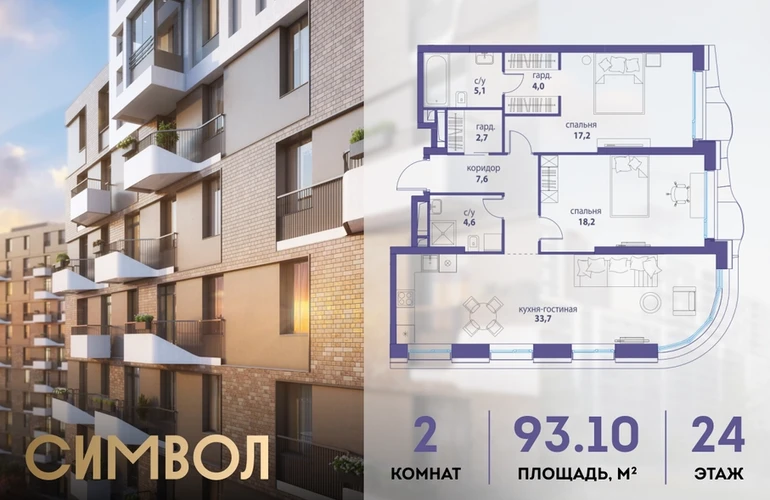 Продается 2-комнатная квартира от застройщика: общая площадь 93.10 м², жилая 35.40 м², кухня 33.70 м², 24-й этаж, жилой квартал «Вдохновение», корпус 35 (секция 1). Срок сдачи: 4 квартал 2027 года. <br> <br>Действует большой выбор скидок и ипотечных программ: вы можете выбрать те, что подходят именно вам. <br> <br>Акции и рассрочка: <br>• Видовые квартиры. Старт продаж! <br>• Беспроцентная рассрочка! <br> <br>Позвоните сейчас и забронируйте квартиру! <br> <br>Квартал бизнес-класса СИМВОЛ — это городское пространство нового поколения в историческом районе Лефортово, на границе ЦАО, в 2 км от Садового кольца. <br>Бионическая архитектура СИМВОЛА превратила Лефортово в суперсовременное и модное пространство. Из окон, с балконов и террас просторных квартир СИМВОЛА открываются отличные виды на город и новый парк «Зеленая река», «протекающий» через все кварталы комплекса на 2 км. <br>В квартале уже есть все, что нужно для комфортной жизни: кафе и рестораны, супермаркеты и магазины, медицинские и физкультурно-оздоровительные центры, салоны красоты и барбершопы, аптеки и оптики, химчистки, пункты доставки и другие сервисы — всего более 90 действующих объектов внутриквартальной инфраструктуры. <br>Для юных жителей СИМВОЛА открыты детский сад и инженерный лицей при МГТУ им. Баумана. <br> <br>Особенности квартала: <br>• Свой парк «Зеленая Река» - 10 га зелени и развлечений на любой вкус! <br>• Уникальная для Москвы архитектура - Проект создан архитектурной мастерской ATRIUM по дизайн-коду британских бюро LDA Design и UHA London. <br>• Богатая инфраструктура с детскими садами и лицеем им. Баумана, кафе и ресторанами, супермаркетами и аптеками, зоной для фитнеса, бассейном и мед. центром. <br>• Квартиры с панорамными окнами, террасами, ванными с окнами и каминами редких форматов. <br>• Закрытые безопасные зелёные дворы-парки без машин!О застройщике