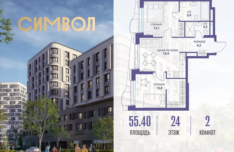 Продается 2-комнатная квартира от застройщика: общая площадь 55.40 м², жилая 27.10 м², кухня 15.40 м², 24-й этаж, жилой квартал «Вдохновение», корпус 35 (секция 1). Срок сдачи: 4 квартал 2027 года. Позвоните сейчас и забронируйте квартиру! Квартал бизнес-класса СИМВОЛ — это городское пространство нового поколения в историческом районе Лефортово, на границе ЦАО, в 2 км от Садового кольца. Бионическая архитектура СИМВОЛА превратила Лефортово в суперсовременное и модное пространство. Из окон, с балконов и террас просторных квартир СИМВОЛА открываются отличные виды на город и новый парк «Зеленая река», «протекающий» через все кварталы комплекса на 2 км. В квартале уже есть все, что нужно для комфортной жизни: кафе и рестораны, супермаркеты и магазины, медицинские и физкультурно-оздоровительные центры, салоны красоты и барбершопы, аптеки и оптики, химчистки, пункты доставки и другие сервисы — всего более 90 действующих объектов внутриквартальной инфраструктуры. Для юных жителей СИМВОЛА открыты детский сад и инженерный лицей при МГТУ им. Баумана. Особенности квартала: • Свой парк «Зеленая Река» - 10 га зелени и развлечений на любой вкус! • Уникальная для Москвы архитектура - Проект создан архитектурной мастерской ATRIUM по дизайн-коду британских бюро LDA Design и UHA London. • Богатая инфраструктура с детскими садами и лицеем им. Баумана, кафе и ресторанами, супермаркетами и аптеками, зоной для фитнеса, бассейном и мед. центром. • Квартиры с панорамными окнами, террасами, ванными с окнами и каминами редких форматов. • Закрытые безопасные зелёные дворы-парки без машин!О застройщике