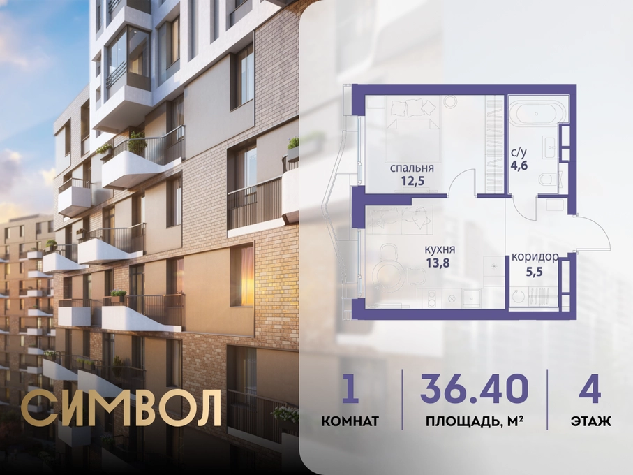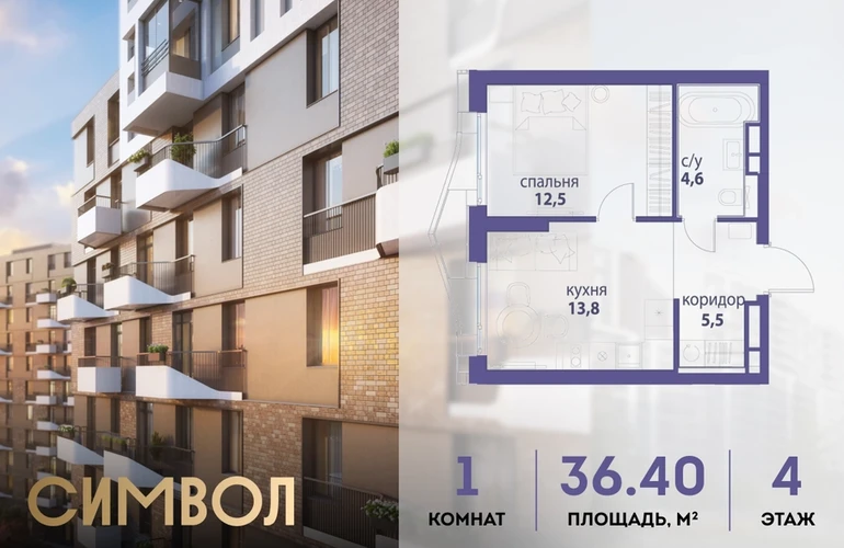 Продается 1-комнатная квартира от застройщика: общая площадь 36.40 м², жилая 12.50 м², кухня 13.80 м², 4-й этаж, жилой квартал «Вдохновение», корпус 33 (секция 3). Срок сдачи: 4 квартал 2027 года. <br> <br>Действует большой выбор скидок и ипотечных программ: вы можете выбрать те, что подходят именно вам. <br> <br>Акции и рассрочка: <br>• Видовые квартиры. Старт продаж! <br>• Беспроцентная рассрочка! <br> <br>Позвоните сейчас и забронируйте квартиру! <br> <br>Квартал бизнес-класса СИМВОЛ — это городское пространство нового поколения в историческом районе Лефортово, на границе ЦАО, в 2 км от Садового кольца. <br>Бионическая архитектура СИМВОЛА превратила Лефортово в суперсовременное и модное пространство. Из окон, с балконов и террас просторных квартир СИМВОЛА открываются отличные виды на город и новый парк «Зеленая река», «протекающий» через все кварталы комплекса на 2 км. <br>В квартале уже есть все, что нужно для комфортной жизни: кафе и рестораны, супермаркеты и магазины, медицинские и физкультурно-оздоровительные центры, салоны красоты и барбершопы, аптеки и оптики, химчистки, пункты доставки и другие сервисы — всего более 90 действующих объектов внутриквартальной инфраструктуры. <br>Для юных жителей СИМВОЛА открыты детский сад и инженерный лицей при МГТУ им. Баумана. <br> <br>Особенности квартала: <br>• Свой парк «Зеленая Река» - 10 га зелени и развлечений на любой вкус! <br>• Уникальная для Москвы архитектура - Проект создан архитектурной мастерской ATRIUM по дизайн-коду британских бюро LDA Design и UHA London. <br>• Богатая инфраструктура с детскими садами и лицеем им. Баумана, кафе и ресторанами, супермаркетами и аптеками, зоной для фитнеса, бассейном и мед. центром. <br>• Квартиры с панорамными окнами, террасами, ванными с окнами и каминами редких форматов. <br>• Закрытые безопасные зелёные дворы-парки без машин!О застройщике