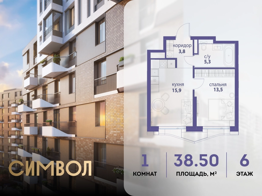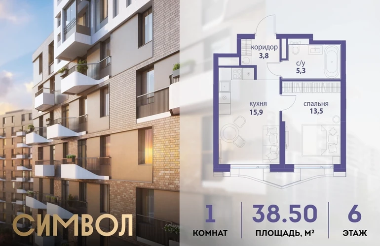 Продается 1-комнатная квартира от застройщика: общая площадь 38.50 м², жилая 13.50 м², кухня 15.90 м², 6-й этаж, жилой квартал «Вдохновение», корпус 33 (секция 2). Срок сдачи: 4 квартал 2027 года. <br> <br>Действует большой выбор скидок и ипотечных программ: вы можете выбрать те, что подходят именно вам. <br> <br>Акции и рассрочка: <br>• Видовые квартиры. Старт продаж! <br>• Беспроцентная рассрочка! <br> <br>Позвоните сейчас и забронируйте квартиру! <br> <br>Квартал бизнес-класса СИМВОЛ — это городское пространство нового поколения в историческом районе Лефортово, на границе ЦАО, в 2 км от Садового кольца. <br>Бионическая архитектура СИМВОЛА превратила Лефортово в суперсовременное и модное пространство. Из окон, с балконов и террас просторных квартир СИМВОЛА открываются отличные виды на город и новый парк «Зеленая река», «протекающий» через все кварталы комплекса на 2 км. <br>В квартале уже есть все, что нужно для комфортной жизни: кафе и рестораны, супермаркеты и магазины, медицинские и физкультурно-оздоровительные центры, салоны красоты и барбершопы, аптеки и оптики, химчистки, пункты доставки и другие сервисы — всего более 90 действующих объектов внутриквартальной инфраструктуры. <br>Для юных жителей СИМВОЛА открыты детский сад и инженерный лицей при МГТУ им. Баумана. <br> <br>Особенности квартала: <br>• Свой парк «Зеленая Река» - 10 га зелени и развлечений на любой вкус! <br>• Уникальная для Москвы архитектура - Проект создан архитектурной мастерской ATRIUM по дизайн-коду британских бюро LDA Design и UHA London. <br>• Богатая инфраструктура с детскими садами и лицеем им. Баумана, кафе и ресторанами, супермаркетами и аптеками, зоной для фитнеса, бассейном и мед. центром. <br>• Квартиры с панорамными окнами, террасами, ванными с окнами и каминами редких форматов. <br>• Закрытые безопасные зелёные дворы-парки без машин!О застройщике