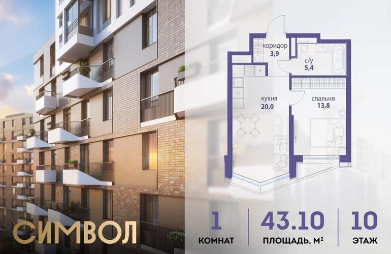 Продается 1-комнатная квартира от застройщика: общая площадь 43.10 м², жилая 13.80 м², кухня 20.00 м², 10-й этаж, жилой квартал «Вдохновение», корпус 33 (секция 2). Срок сдачи: 4 квартал 2027 года. <br> <br>Действует большой выбор скидок и ипотечных программ: вы можете выбрать те, что подходят именно вам. <br> <br>Акции и рассрочка: <br>• Видовые квартиры. Старт продаж! <br>• Беспроцентная рассрочка! <br> <br>Позвоните сейчас и забронируйте квартиру! <br> <br>Квартал бизнес-класса СИМВОЛ — это городское пространство нового поколения в историческом районе Лефортово, на границе ЦАО, в 2 км от Садового кольца. <br>Бионическая архитектура СИМВОЛА превратила Лефортово в суперсовременное и модное пространство. Из окон, с балконов и террас просторных квартир СИМВОЛА открываются отличные виды на город и новый парк «Зеленая река», «протекающий» через все кварталы комплекса на 2 км. <br>В квартале уже есть все, что нужно для комфортной жизни: кафе и рестораны, супермаркеты и магазины, медицинские и физкультурно-оздоровительные центры, салоны красоты и барбершопы, аптеки и оптики, химчистки, пункты доставки и другие сервисы — всего более 90 действующих объектов внутриквартальной инфраструктуры. <br>Для юных жителей СИМВОЛА открыты детский сад и инженерный лицей при МГТУ им. Баумана. <br> <br>Особенности квартала: <br>• Свой парк «Зеленая Река» - 10 га зелени и развлечений на любой вкус! <br>• Уникальная для Москвы архитектура - Проект создан архитектурной мастерской ATRIUM по дизайн-коду британских бюро LDA Design и UHA London. <br>• Богатая инфраструктура с детскими садами и лицеем им. Баумана, кафе и ресторанами, супермаркетами и аптеками, зоной для фитнеса, бассейном и мед. центром. <br>• Квартиры с панорамными окнами, террасами, ванными с окнами и каминами редких форматов. <br>• Закрытые безопасные зелёные дворы-парки без машин!О застройщике