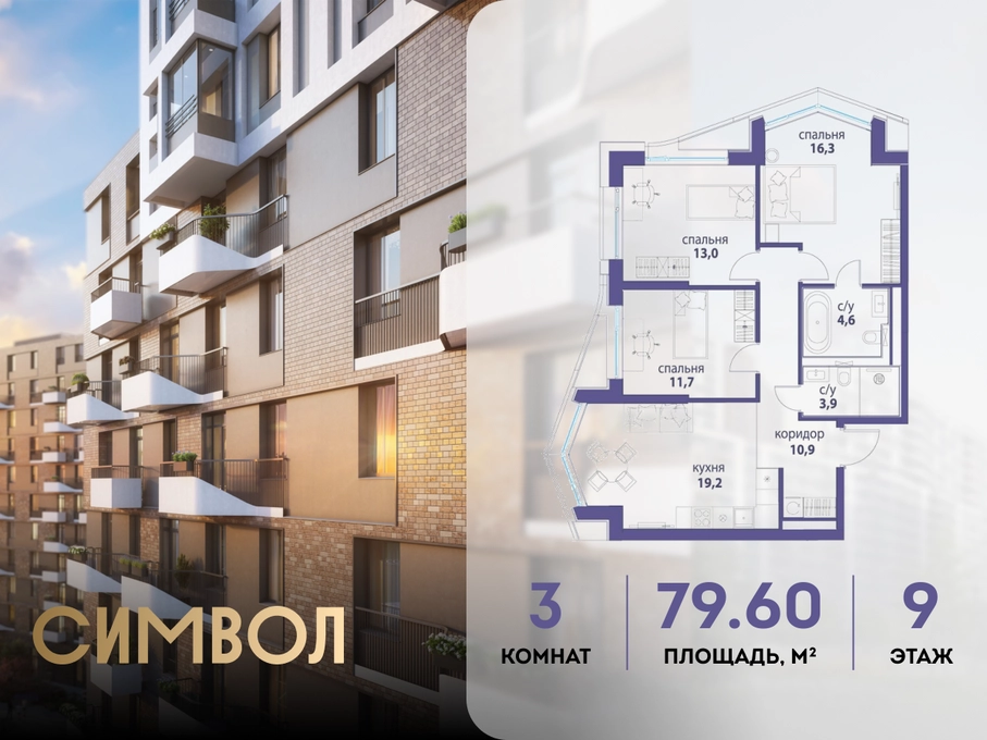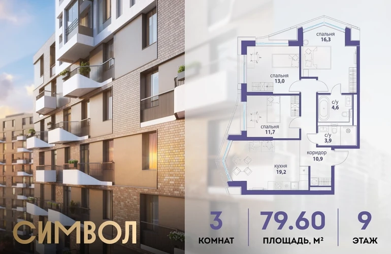 Продается 3-комнатная квартира от застройщика: общая площадь 79.60 м², жилая 41.00 м², кухня 19.20 м², 9-й этаж, жилой квартал «Вдохновение», корпус 33 (секция 3). Срок сдачи: 4 квартал 2027 года. <br> <br>Действует большой выбор скидок и ипотечных программ: вы можете выбрать те, что подходят именно вам. <br> <br>Акции и рассрочка: <br>• Видовые квартиры. Старт продаж! <br>• Беспроцентная рассрочка! <br> <br>Позвоните сейчас и забронируйте квартиру! <br> <br>Квартал бизнес-класса СИМВОЛ — это городское пространство нового поколения в историческом районе Лефортово, на границе ЦАО, в 2 км от Садового кольца. <br>Бионическая архитектура СИМВОЛА превратила Лефортово в суперсовременное и модное пространство. Из окон, с балконов и террас просторных квартир СИМВОЛА открываются отличные виды на город и новый парк «Зеленая река», «протекающий» через все кварталы комплекса на 2 км. <br>В квартале уже есть все, что нужно для комфортной жизни: кафе и рестораны, супермаркеты и магазины, медицинские и физкультурно-оздоровительные центры, салоны красоты и барбершопы, аптеки и оптики, химчистки, пункты доставки и другие сервисы — всего более 90 действующих объектов внутриквартальной инфраструктуры. <br>Для юных жителей СИМВОЛА открыты детский сад и инженерный лицей при МГТУ им. Баумана. <br> <br>Особенности квартала: <br>• Свой парк «Зеленая Река» - 10 га зелени и развлечений на любой вкус! <br>• Уникальная для Москвы архитектура - Проект создан архитектурной мастерской ATRIUM по дизайн-коду британских бюро LDA Design и UHA London. <br>• Богатая инфраструктура с детскими садами и лицеем им. Баумана, кафе и ресторанами, супермаркетами и аптеками, зоной для фитнеса, бассейном и мед. центром. <br>• Квартиры с панорамными окнами, террасами, ванными с окнами и каминами редких форматов. <br>• Закрытые безопасные зелёные дворы-парки без машин!О застройщике