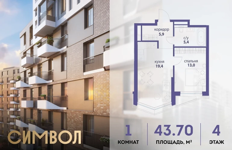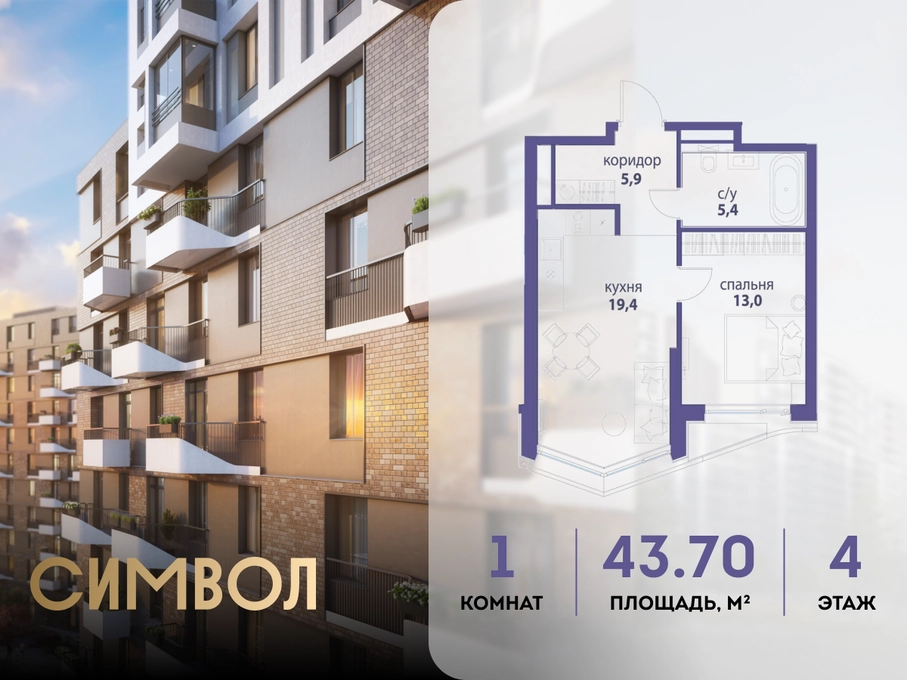 Продается 1-комнатная квартира от застройщика: общая площадь 43.70 м², жилая 13.00 м², кухня 19.40 м², 4-й этаж, жилой квартал «Вдохновение», корпус 33 (секция 2). Срок сдачи: 4 квартал 2027 года. <br> <br>Действует большой выбор скидок и ипотечных программ: вы можете выбрать те, что подходят именно вам. <br> <br>Акции и рассрочка: <br>• Видовые квартиры. Старт продаж! <br>• Беспроцентная рассрочка! <br> <br>Позвоните сейчас и забронируйте квартиру! <br> <br>Квартал бизнес-класса СИМВОЛ — это городское пространство нового поколения в историческом районе Лефортово, на границе ЦАО, в 2 км от Садового кольца. <br>Бионическая архитектура СИМВОЛА превратила Лефортово в суперсовременное и модное пространство. Из окон, с балконов и террас просторных квартир СИМВОЛА открываются отличные виды на город и новый парк «Зеленая река», «протекающий» через все кварталы комплекса на 2 км. <br>В квартале уже есть все, что нужно для комфортной жизни: кафе и рестораны, супермаркеты и магазины, медицинские и физкультурно-оздоровительные центры, салоны красоты и барбершопы, аптеки и оптики, химчистки, пункты доставки и другие сервисы — всего более 90 действующих объектов внутриквартальной инфраструктуры. <br>Для юных жителей СИМВОЛА открыты детский сад и инженерный лицей при МГТУ им. Баумана. <br> <br>Особенности квартала: <br>• Свой парк «Зеленая Река» - 10 га зелени и развлечений на любой вкус! <br>• Уникальная для Москвы архитектура - Проект создан архитектурной мастерской ATRIUM по дизайн-коду британских бюро LDA Design и UHA London. <br>• Богатая инфраструктура с детскими садами и лицеем им. Баумана, кафе и ресторанами, супермаркетами и аптеками, зоной для фитнеса, бассейном и мед. центром. <br>• Квартиры с панорамными окнами, террасами, ванными с окнами и каминами редких форматов. <br>• Закрытые безопасные зелёные дворы-парки без машин!О застройщике