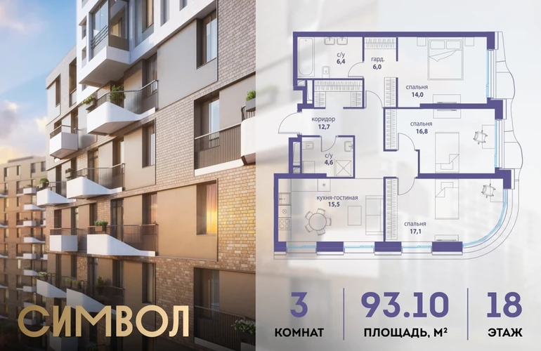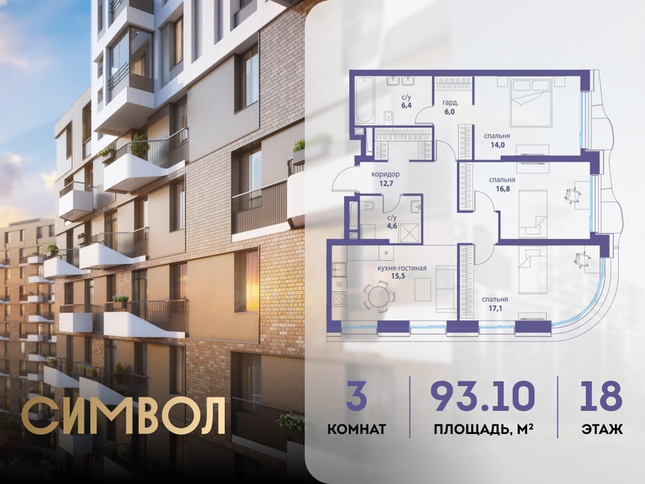 Продается 3-комнатная квартира от застройщика: общая площадь 93.10 м², жилая 47.90 м², кухня 15.50 м², 18-й этаж, жилой квартал «Вдохновение», корпус 34 (секция 1). Срок сдачи: 4 квартал 2027 года. <br> <br>Действует большой выбор скидок и ипотечных программ: вы можете выбрать те, что подходят именно вам. <br> <br>Акции и рассрочка: <br>• Видовые квартиры. Старт продаж! <br>• Беспроцентная рассрочка! <br> <br>Позвоните сейчас и забронируйте квартиру! <br> <br>Квартал бизнес-класса СИМВОЛ — это городское пространство нового поколения в историческом районе Лефортово, на границе ЦАО, в 2 км от Садового кольца. <br>Бионическая архитектура СИМВОЛА превратила Лефортово в суперсовременное и модное пространство. Из окон, с балконов и террас просторных квартир СИМВОЛА открываются отличные виды на город и новый парк «Зеленая река», «протекающий» через все кварталы комплекса на 2 км. <br>В квартале уже есть все, что нужно для комфортной жизни: кафе и рестораны, супермаркеты и магазины, медицинские и физкультурно-оздоровительные центры, салоны красоты и барбершопы, аптеки и оптики, химчистки, пункты доставки и другие сервисы — всего более 90 действующих объектов внутриквартальной инфраструктуры. <br>Для юных жителей СИМВОЛА открыты детский сад и инженерный лицей при МГТУ им. Баумана. <br> <br>Особенности квартала: <br>• Свой парк «Зеленая Река» - 10 га зелени и развлечений на любой вкус! <br>• Уникальная для Москвы архитектура - Проект создан архитектурной мастерской ATRIUM по дизайн-коду британских бюро LDA Design и UHA London. <br>• Богатая инфраструктура с детскими садами и лицеем им. Баумана, кафе и ресторанами, супермаркетами и аптеками, зоной для фитнеса, бассейном и мед. центром. <br>• Квартиры с панорамными окнами, террасами, ванными с окнами и каминами редких форматов. <br>• Закрытые безопасные зелёные дворы-парки без машин!О застройщике
