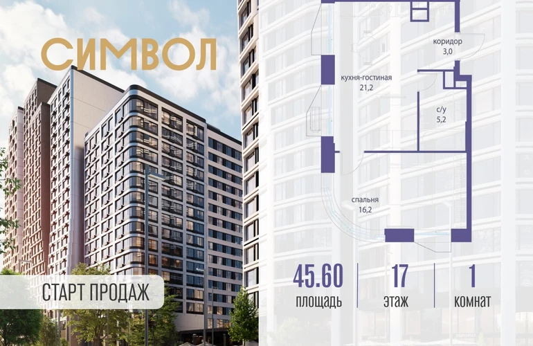 Продается 1-комнатная квартира от застройщика: общая площадь 45.60 м², жилая 16.20 м², кухня 21.20 м², 17-й этаж, жилой квартал «Гордость», корпус 36 (секция 1). Срок сдачи: 2 квартал 2029 года. Позвоните сейчас и забронируйте квартиру! Квартал бизнес-класса СИМВОЛ — это городское пространство нового поколения в историческом районе Лефортово, на границе ЦАО, в 2 км от Садового кольца. Бионическая архитектура СИМВОЛА превратила Лефортово в суперсовременное и модное пространство. Из окон, с балконов и террас просторных квартир СИМВОЛА открываются отличные виды на город и новый парк «Зеленая река», «протекающий» через все кварталы комплекса на 2 км. В квартале уже есть все, что нужно для комфортной жизни: кафе и рестораны, супермаркеты и магазины, медицинские и физкультурно-оздоровительные центры, салоны красоты и барбершопы, аптеки и оптики, химчистки, пункты доставки и другие сервисы — всего более 90 действующих объектов внутриквартальной инфраструктуры. Для юных жителей СИМВОЛА открыты детский сад и инженерный лицей при МГТУ им. Баумана. Особенности квартала: • Свой парк «Зеленая Река» - 10 га зелени и развлечений на любой вкус! • Уникальная для Москвы архитектура - Проект создан архитектурной мастерской ATRIUM по дизайн-коду британских бюро LDA Design и UHA London. • Богатая инфраструктура с детскими садами и лицеем им. Баумана, кафе и ресторанами, супермаркетами и аптеками, зоной для фитнеса, бассейном и мед. центром. • Квартиры с панорамными окнами, террасами, ванными с окнами и каминами редких форматов. • Закрытые безопасные зелёные дворы-парки без машин!О застройщике
