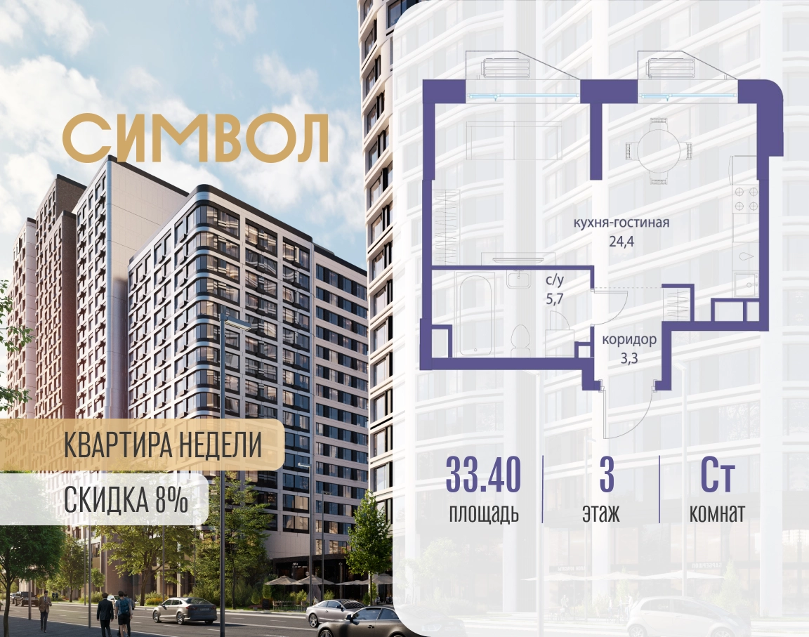 Продается квартира-студия от застройщика: общая площадь 33.40 м², жилая 10.00 м², кухня 14.40 м², 3-й этаж, жилой квартал «Гордость», корпус 36 (секция 4). Срок сдачи: 2 квартал 2029 года. Позвоните сейчас и забронируйте квартиру! Квартал бизнес-класса СИМВОЛ — это городское пространство нового поколения в историческом районе Лефортово, на границе ЦАО, в 2 км от Садового кольца. Бионическая архитектура СИМВОЛА превратила Лефортово в суперсовременное и модное пространство. Из окон, с балконов и террас просторных квартир СИМВОЛА открываются отличные виды на город и новый парк «Зеленая река», «протекающий» через все кварталы комплекса на 2 км. В квартале уже есть все, что нужно для комфортной жизни: кафе и рестораны, супермаркеты и магазины, медицинские и физкультурно-оздоровительные центры, салоны красоты и барбершопы, аптеки и оптики, химчистки, пункты доставки и другие сервисы — всего более 90 действующих объектов внутриквартальной инфраструктуры. Для юных жителей СИМВОЛА открыты детский сад и инженерный лицей при МГТУ им. Баумана. Особенности квартала: • Свой парк «Зеленая Река» - 10 га зелени и развлечений на любой вкус! • Уникальная для Москвы архитектура - Проект создан архитектурной мастерской ATRIUM по дизайн-коду британских бюро LDA Design и UHA London. • Богатая инфраструктура с детскими садами и лицеем им. Баумана, кафе и ресторанами, супермаркетами и аптеками, зоной для фитнеса, бассейном и мед. центром. • Квартиры с панорамными окнами, террасами, ванными с окнами и каминами редких форматов. • Закрытые безопасные зелёные дворы-парки без машин!О застройщике