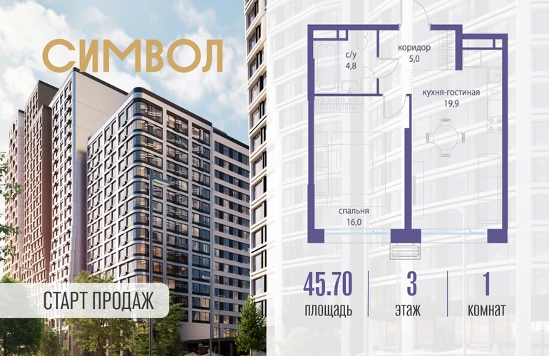 Продается 1-комнатная квартира от застройщика: общая площадь 45.70 м², жилая 16.00 м², кухня 19.90 м², 3-й этаж, жилой квартал «Гордость», корпус 36 (секция 3). Срок сдачи: 2 квартал 2029 года. Позвоните сейчас и забронируйте квартиру! Квартал бизнес-класса СИМВОЛ — это городское пространство нового поколения в историческом районе Лефортово, на границе ЦАО, в 2 км от Садового кольца. Бионическая архитектура СИМВОЛА превратила Лефортово в суперсовременное и модное пространство. Из окон, с балконов и террас просторных квартир СИМВОЛА открываются отличные виды на город и новый парк «Зеленая река», «протекающий» через все кварталы комплекса на 2 км. В квартале уже есть все, что нужно для комфортной жизни: кафе и рестораны, супермаркеты и магазины, медицинские и физкультурно-оздоровительные центры, салоны красоты и барбершопы, аптеки и оптики, химчистки, пункты доставки и другие сервисы — всего более 90 действующих объектов внутриквартальной инфраструктуры. Для юных жителей СИМВОЛА открыты детский сад и инженерный лицей при МГТУ им. Баумана. Особенности квартала: • Свой парк «Зеленая Река» - 10 га зелени и развлечений на любой вкус! • Уникальная для Москвы архитектура - Проект создан архитектурной мастерской ATRIUM по дизайн-коду британских бюро LDA Design и UHA London. • Богатая инфраструктура с детскими садами и лицеем им. Баумана, кафе и ресторанами, супермаркетами и аптеками, зоной для фитнеса, бассейном и мед. центром. • Квартиры с панорамными окнами, террасами, ванными с окнами и каминами редких форматов. • Закрытые безопасные зелёные дворы-парки без машин!О застройщике
