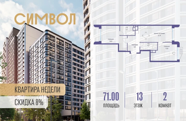 Продается 2-комнатная квартира от застройщика: общая площадь 71.00 м², жилая 32.70 м², кухня 21.90 м², 13-й этаж, жилой квартал «Гордость», корпус 36 (секция 1). Срок сдачи: 2 квартал 2029 года. Позвоните сейчас и забронируйте квартиру! Квартал бизнес-класса СИМВОЛ — это городское пространство нового поколения в историческом районе Лефортово, на границе ЦАО, в 2 км от Садового кольца. Бионическая архитектура СИМВОЛА превратила Лефортово в суперсовременное и модное пространство. Из окон, с балконов и террас просторных квартир СИМВОЛА открываются отличные виды на город и новый парк «Зеленая река», «протекающий» через все кварталы комплекса на 2 км. В квартале уже есть все, что нужно для комфортной жизни: кафе и рестораны, супермаркеты и магазины, медицинские и физкультурно-оздоровительные центры, салоны красоты и барбершопы, аптеки и оптики, химчистки, пункты доставки и другие сервисы — всего более 90 действующих объектов внутриквартальной инфраструктуры. Для юных жителей СИМВОЛА открыты детский сад и инженерный лицей при МГТУ им. Баумана. Особенности квартала: • Свой парк «Зеленая Река» - 10 га зелени и развлечений на любой вкус! • Уникальная для Москвы архитектура - Проект создан архитектурной мастерской ATRIUM по дизайн-коду британских бюро LDA Design и UHA London. • Богатая инфраструктура с детскими садами и лицеем им. Баумана, кафе и ресторанами, супермаркетами и аптеками, зоной для фитнеса, бассейном и мед. центром. • Квартиры с панорамными окнами, террасами, ванными с окнами и каминами редких форматов. • Закрытые безопасные зелёные дворы-парки без машин!О застройщике