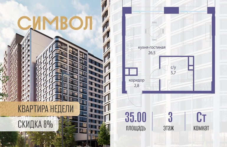 Продается квартира-студия от застройщика: общая площадь 35.00 м², жилая 10.00 м², кухня 16.50 м², 3-й этаж, жилой квартал «Гордость», корпус 36 (секция 5). Срок сдачи: 2 квартал 2029 года. Позвоните сейчас и забронируйте квартиру! Квартал бизнес-класса СИМВОЛ — это городское пространство нового поколения в историческом районе Лефортово, на границе ЦАО, в 2 км от Садового кольца. Бионическая архитектура СИМВОЛА превратила Лефортово в суперсовременное и модное пространство. Из окон, с балконов и террас просторных квартир СИМВОЛА открываются отличные виды на город и новый парк «Зеленая река», «протекающий» через все кварталы комплекса на 2 км. В квартале уже есть все, что нужно для комфортной жизни: кафе и рестораны, супермаркеты и магазины, медицинские и физкультурно-оздоровительные центры, салоны красоты и барбершопы, аптеки и оптики, химчистки, пункты доставки и другие сервисы — всего более 90 действующих объектов внутриквартальной инфраструктуры. Для юных жителей СИМВОЛА открыты детский сад и инженерный лицей при МГТУ им. Баумана. Особенности квартала: • Свой парк «Зеленая Река» - 10 га зелени и развлечений на любой вкус! • Уникальная для Москвы архитектура - Проект создан архитектурной мастерской ATRIUM по дизайн-коду британских бюро LDA Design и UHA London. • Богатая инфраструктура с детскими садами и лицеем им. Баумана, кафе и ресторанами, супермаркетами и аптеками, зоной для фитнеса, бассейном и мед. центром. • Квартиры с панорамными окнами, террасами, ванными с окнами и каминами редких форматов. • Закрытые безопасные зелёные дворы-парки без машин!О застройщике