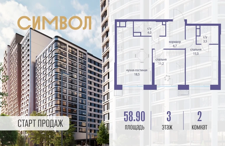 Продается 2-комнатная квартира от застройщика: общая площадь 58.90 м², жилая 26.20 м², кухня 18.50 м², 3-й этаж, жилой квартал «Гордость», корпус 36 (секция 5). Срок сдачи: 2 квартал 2029 года. Позвоните сейчас и забронируйте квартиру! Квартал бизнес-класса СИМВОЛ — это городское пространство нового поколения в историческом районе Лефортово, на границе ЦАО, в 2 км от Садового кольца. Бионическая архитектура СИМВОЛА превратила Лефортово в суперсовременное и модное пространство. Из окон, с балконов и террас просторных квартир СИМВОЛА открываются отличные виды на город и новый парк «Зеленая река», «протекающий» через все кварталы комплекса на 2 км. В квартале уже есть все, что нужно для комфортной жизни: кафе и рестораны, супермаркеты и магазины, медицинские и физкультурно-оздоровительные центры, салоны красоты и барбершопы, аптеки и оптики, химчистки, пункты доставки и другие сервисы — всего более 90 действующих объектов внутриквартальной инфраструктуры. Для юных жителей СИМВОЛА открыты детский сад и инженерный лицей при МГТУ им. Баумана. Особенности квартала: • Свой парк «Зеленая Река» - 10 га зелени и развлечений на любой вкус! • Уникальная для Москвы архитектура - Проект создан архитектурной мастерской ATRIUM по дизайн-коду британских бюро LDA Design и UHA London. • Богатая инфраструктура с детскими садами и лицеем им. Баумана, кафе и ресторанами, супермаркетами и аптеками, зоной для фитнеса, бассейном и мед. центром. • Квартиры с панорамными окнами, террасами, ванными с окнами и каминами редких форматов. • Закрытые безопасные зелёные дворы-парки без машин!О застройщике