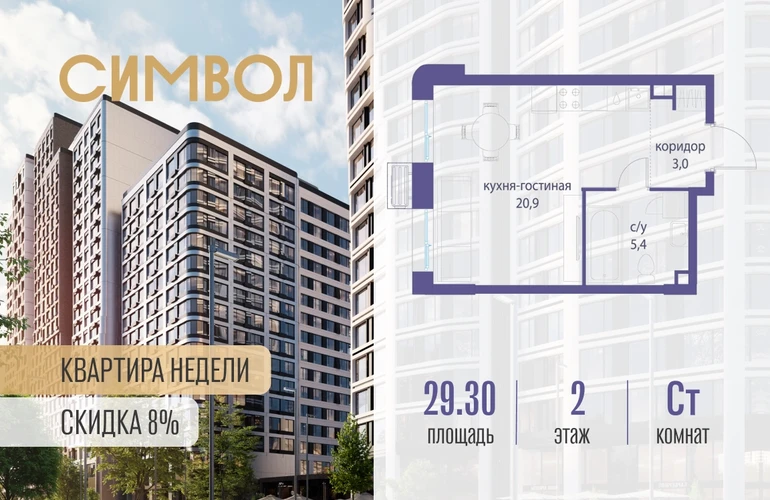 Продается квартира-студия от застройщика: общая площадь 29.30 м², жилая 10.00 м², кухня 10.90 м², 2-й этаж, жилой квартал «Гордость», корпус 36 (секция 5). Срок сдачи: 2 квартал 2029 года. Позвоните сейчас и забронируйте квартиру! Квартал бизнес-класса СИМВОЛ — это городское пространство нового поколения в историческом районе Лефортово, на границе ЦАО, в 2 км от Садового кольца. Бионическая архитектура СИМВОЛА превратила Лефортово в суперсовременное и модное пространство. Из окон, с балконов и террас просторных квартир СИМВОЛА открываются отличные виды на город и новый парк «Зеленая река», «протекающий» через все кварталы комплекса на 2 км. В квартале уже есть все, что нужно для комфортной жизни: кафе и рестораны, супермаркеты и магазины, медицинские и физкультурно-оздоровительные центры, салоны красоты и барбершопы, аптеки и оптики, химчистки, пункты доставки и другие сервисы — всего более 90 действующих объектов внутриквартальной инфраструктуры. Для юных жителей СИМВОЛА открыты детский сад и инженерный лицей при МГТУ им. Баумана. Особенности квартала: • Свой парк «Зеленая Река» - 10 га зелени и развлечений на любой вкус! • Уникальная для Москвы архитектура - Проект создан архитектурной мастерской ATRIUM по дизайн-коду британских бюро LDA Design и UHA London. • Богатая инфраструктура с детскими садами и лицеем им. Баумана, кафе и ресторанами, супермаркетами и аптеками, зоной для фитнеса, бассейном и мед. центром. • Квартиры с панорамными окнами, террасами, ванными с окнами и каминами редких форматов. • Закрытые безопасные зелёные дворы-парки без машин!О застройщике
