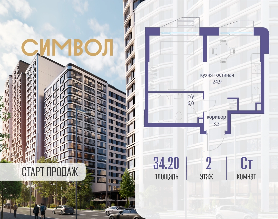 Продается квартира-студия от застройщика: общая площадь 34.20 м², жилая 10.00 м², кухня 15.50 м², 2-й этаж, жилой квартал «Гордость», корпус 36 (секция 5). Срок сдачи: 2 квартал 2029 года. Позвоните сейчас и забронируйте квартиру! Квартал бизнес-класса СИМВОЛ — это городское пространство нового поколения в историческом районе Лефортово, на границе ЦАО, в 2 км от Садового кольца. Бионическая архитектура СИМВОЛА превратила Лефортово в суперсовременное и модное пространство. Из окон, с балконов и террас просторных квартир СИМВОЛА открываются отличные виды на город и новый парк «Зеленая река», «протекающий» через все кварталы комплекса на 2 км. В квартале уже есть все, что нужно для комфортной жизни: кафе и рестораны, супермаркеты и магазины, медицинские и физкультурно-оздоровительные центры, салоны красоты и барбершопы, аптеки и оптики, химчистки, пункты доставки и другие сервисы — всего более 90 действующих объектов внутриквартальной инфраструктуры. Для юных жителей СИМВОЛА открыты детский сад и инженерный лицей при МГТУ им. Баумана. Особенности квартала: • Свой парк «Зеленая Река» - 10 га зелени и развлечений на любой вкус! • Уникальная для Москвы архитектура - Проект создан архитектурной мастерской ATRIUM по дизайн-коду британских бюро LDA Design и UHA London. • Богатая инфраструктура с детскими садами и лицеем им. Баумана, кафе и ресторанами, супермаркетами и аптеками, зоной для фитнеса, бассейном и мед. центром. • Квартиры с панорамными окнами, террасами, ванными с окнами и каминами редких форматов. • Закрытые безопасные зелёные дворы-парки без машин!О застройщике