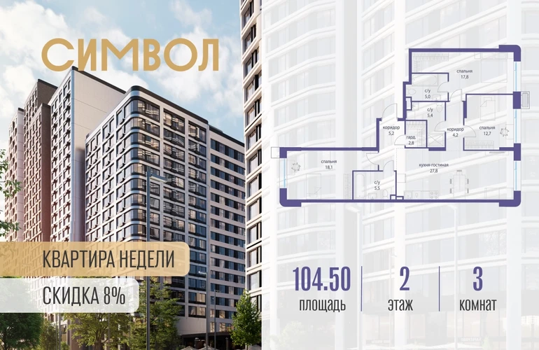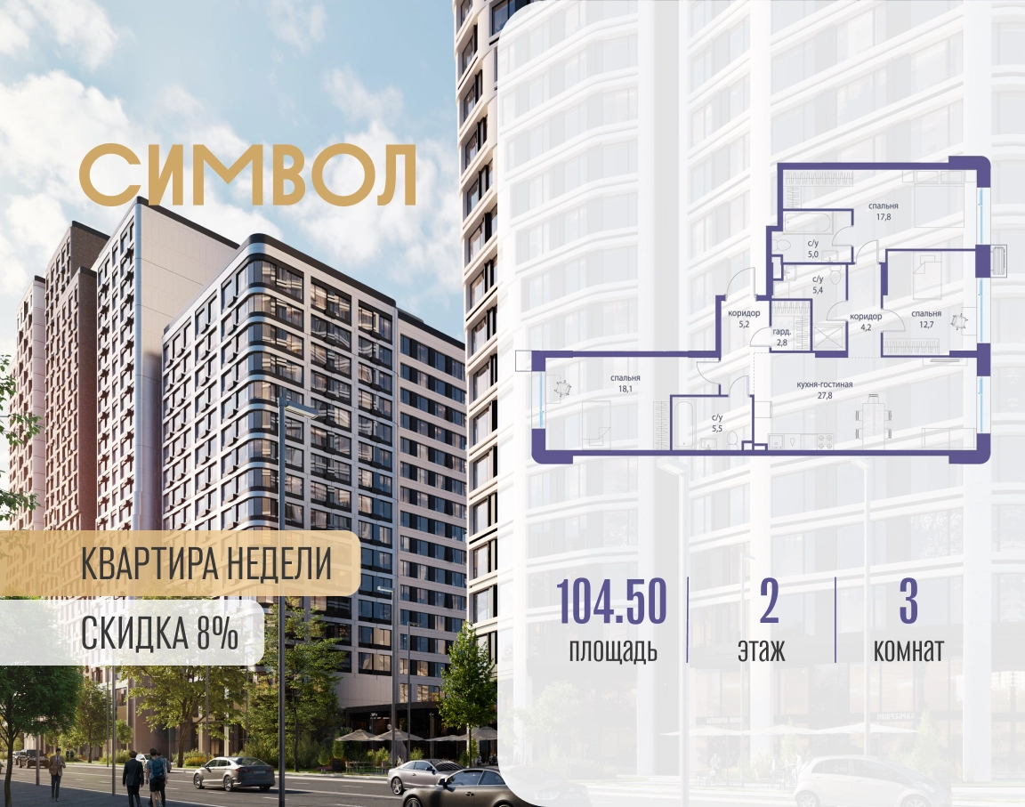 Продается 3-комнатная квартира от застройщика: общая площадь 104.50 м², жилая 48.60 м², кухня 27.80 м², 2-й этаж, жилой квартал «Гордость», корпус 36 (секция 2). Срок сдачи: 2 квартал 2029 года. Позвоните сейчас и забронируйте квартиру! Квартал бизнес-класса СИМВОЛ — это городское пространство нового поколения в историческом районе Лефортово, на границе ЦАО, в 2 км от Садового кольца. Бионическая архитектура СИМВОЛА превратила Лефортово в суперсовременное и модное пространство. Из окон, с балконов и террас просторных квартир СИМВОЛА открываются отличные виды на город и новый парк «Зеленая река», «протекающий» через все кварталы комплекса на 2 км. В квартале уже есть все, что нужно для комфортной жизни: кафе и рестораны, супермаркеты и магазины, медицинские и физкультурно-оздоровительные центры, салоны красоты и барбершопы, аптеки и оптики, химчистки, пункты доставки и другие сервисы — всего более 90 действующих объектов внутриквартальной инфраструктуры. Для юных жителей СИМВОЛА открыты детский сад и инженерный лицей при МГТУ им. Баумана. Особенности квартала: • Свой парк «Зеленая Река» - 10 га зелени и развлечений на любой вкус! • Уникальная для Москвы архитектура - Проект создан архитектурной мастерской ATRIUM по дизайн-коду британских бюро LDA Design и UHA London. • Богатая инфраструктура с детскими садами и лицеем им. Баумана, кафе и ресторанами, супермаркетами и аптеками, зоной для фитнеса, бассейном и мед. центром. • Квартиры с панорамными окнами, террасами, ванными с окнами и каминами редких форматов. • Закрытые безопасные зелёные дворы-парки без машин!О застройщике