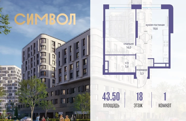 Продается 1-комнатная квартира от застройщика: общая площадь 43.50 м², жилая 16.00 м², кухня 18.60 м², 18-й этаж, жилой квартал «Гордость», корпус 36 (секция 3). Срок сдачи: 2 квартал 2029 года. Позвоните сейчас и забронируйте квартиру! Квартал бизнес-класса СИМВОЛ — это городское пространство нового поколения в историческом районе Лефортово, на границе ЦАО, в 2 км от Садового кольца. Бионическая архитектура СИМВОЛА превратила Лефортово в суперсовременное и модное пространство. Из окон, с балконов и террас просторных квартир СИМВОЛА открываются отличные виды на город и новый парк «Зеленая река», «протекающий» через все кварталы комплекса на 2 км. В квартале уже есть все, что нужно для комфортной жизни: кафе и рестораны, супермаркеты и магазины, медицинские и физкультурно-оздоровительные центры, салоны красоты и барбершопы, аптеки и оптики, химчистки, пункты доставки и другие сервисы — всего более 90 действующих объектов внутриквартальной инфраструктуры. Для юных жителей СИМВОЛА открыты детский сад и инженерный лицей при МГТУ им. Баумана. Особенности квартала: • Свой парк «Зеленая Река» - 10 га зелени и развлечений на любой вкус! • Уникальная для Москвы архитектура - Проект создан архитектурной мастерской ATRIUM по дизайн-коду британских бюро LDA Design и UHA London. • Богатая инфраструктура с детскими садами и лицеем им. Баумана, кафе и ресторанами, супермаркетами и аптеками, зоной для фитнеса, бассейном и мед. центром. • Квартиры с панорамными окнами, террасами, ванными с окнами и каминами редких форматов. • Закрытые безопасные зелёные дворы-парки без машин!