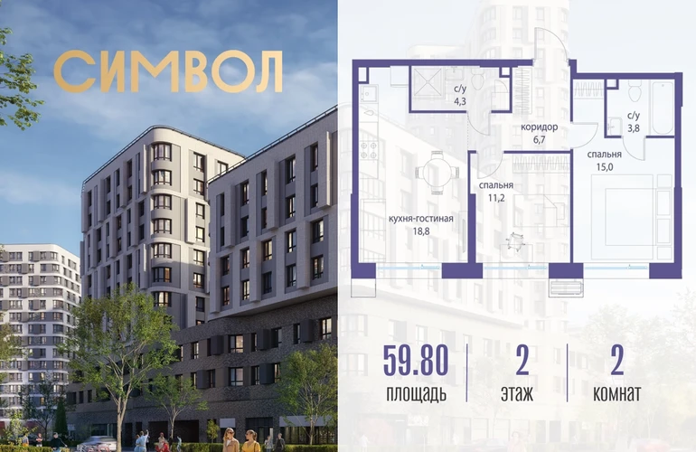 Продается 2-комнатная квартира от застройщика: общая площадь 59.80 м², жилая 26.20 м², кухня 18.80 м², 2-й этаж, жилой квартал «Гордость», корпус 36 (секция 5). Срок сдачи: 2 квартал 2029 года. Позвоните сейчас и забронируйте квартиру! Квартал бизнес-класса СИМВОЛ — это городское пространство нового поколения в историческом районе Лефортово, на границе ЦАО, в 2 км от Садового кольца. Бионическая архитектура СИМВОЛА превратила Лефортово в суперсовременное и модное пространство. Из окон, с балконов и террас просторных квартир СИМВОЛА открываются отличные виды на город и новый парк «Зеленая река», «протекающий» через все кварталы комплекса на 2 км. В квартале уже есть все, что нужно для комфортной жизни: кафе и рестораны, супермаркеты и магазины, медицинские и физкультурно-оздоровительные центры, салоны красоты и барбершопы, аптеки и оптики, химчистки, пункты доставки и другие сервисы — всего более 90 действующих объектов внутриквартальной инфраструктуры. Для юных жителей СИМВОЛА открыты детский сад и инженерный лицей при МГТУ им. Баумана. Особенности квартала: • Свой парк «Зеленая Река» - 10 га зелени и развлечений на любой вкус! • Уникальная для Москвы архитектура - Проект создан архитектурной мастерской ATRIUM по дизайн-коду британских бюро LDA Design и UHA London. • Богатая инфраструктура с детскими садами и лицеем им. Баумана, кафе и ресторанами, супермаркетами и аптеками, зоной для фитнеса, бассейном и мед. центром. • Квартиры с панорамными окнами, террасами, ванными с окнами и каминами редких форматов. • Закрытые безопасные зелёные дворы-парки без машин!О застройщике