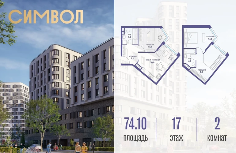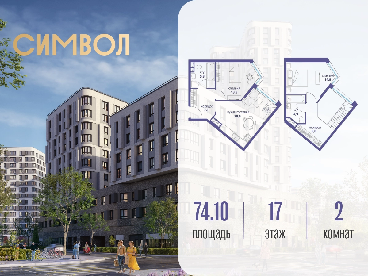 Продается 2-комнатная квартира от застройщика: общая площадь 74.10 м², жилая 28.30 м², кухня 20.00 м², 17-й этаж, жилой квартал «Вдохновение», корпус 28 (секция 1). Срок сдачи: 1 квартал 2026 года. Позвоните сейчас и забронируйте квартиру! Квартал бизнес-класса СИМВОЛ — это городское пространство нового поколения в историческом районе Лефортово, на границе ЦАО, в 2 км от Садового кольца. Бионическая архитектура СИМВОЛА превратила Лефортово в суперсовременное и модное пространство. Из окон, с балконов и террас просторных квартир СИМВОЛА открываются отличные виды на город и новый парк «Зеленая река», «протекающий» через все кварталы комплекса на 2 км. В квартале уже есть все, что нужно для комфортной жизни: кафе и рестораны, супермаркеты и магазины, медицинские и физкультурно-оздоровительные центры, салоны красоты и барбершопы, аптеки и оптики, химчистки, пункты доставки и другие сервисы — всего более 90 действующих объектов внутриквартальной инфраструктуры. Для юных жителей СИМВОЛА открыты детский сад и инженерный лицей при МГТУ им. Баумана. Особенности квартала: • Свой парк «Зеленая Река» - 10 га зелени и развлечений на любой вкус! • Уникальная для Москвы архитектура - Проект создан архитектурной мастерской ATRIUM по дизайн-коду британских бюро LDA Design и UHA London. • Богатая инфраструктура с детскими садами и лицеем им. Баумана, кафе и ресторанами, супермаркетами и аптеками, зоной для фитнеса, бассейном и мед. центром. • Квартиры с панорамными окнами, террасами, ванными с окнами и каминами редких форматов. • Закрытые безопасные зелёные дворы-парки без машин!О застройщике