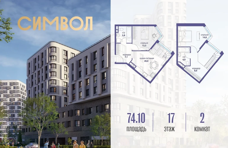 Продается 2-комнатная квартира от застройщика: общая площадь 74.10 м², жилая 28.30 м², кухня 20.00 м², 17-й этаж, жилой квартал «Вдохновение», корпус 28 (секция 1). Срок сдачи: 1 квартал 2026 года. Позвоните сейчас и забронируйте квартиру! Квартал бизнес-класса СИМВОЛ — это городское пространство нового поколения в историческом районе Лефортово, на границе ЦАО, в 2 км от Садового кольца. Бионическая архитектура СИМВОЛА превратила Лефортово в суперсовременное и модное пространство. Из окон, с балконов и террас просторных квартир СИМВОЛА открываются отличные виды на город и новый парк «Зеленая река», «протекающий» через все кварталы комплекса на 2 км. В квартале уже есть все, что нужно для комфортной жизни: кафе и рестораны, супермаркеты и магазины, медицинские и физкультурно-оздоровительные центры, салоны красоты и барбершопы, аптеки и оптики, химчистки, пункты доставки и другие сервисы — всего более 90 действующих объектов внутриквартальной инфраструктуры. Для юных жителей СИМВОЛА открыты детский сад и инженерный лицей при МГТУ им. Баумана. Особенности квартала: • Свой парк «Зеленая Река» - 10 га зелени и развлечений на любой вкус! • Уникальная для Москвы архитектура - Проект создан архитектурной мастерской ATRIUM по дизайн-коду британских бюро LDA Design и UHA London. • Богатая инфраструктура с детскими садами и лицеем им. Баумана, кафе и ресторанами, супермаркетами и аптеками, зоной для фитнеса, бассейном и мед. центром. • Квартиры с панорамными окнами, террасами, ванными с окнами и каминами редких форматов. • Закрытые безопасные зелёные дворы-парки без машин!О застройщике