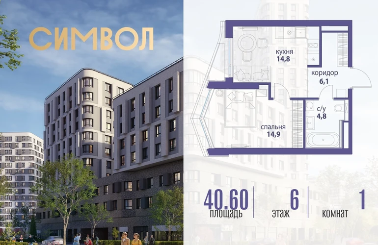 Продается 1-комнатная квартира от застройщика: общая площадь 40.60 м², жилая 14.90 м², кухня 14.80 м², 6-й этаж, жилой квартал «Вдохновение», корпус 33 (секция 3). Срок сдачи: 4 квартал 2027 года. Позвоните сейчас и забронируйте квартиру! Квартал бизнес-класса СИМВОЛ — это городское пространство нового поколения в историческом районе Лефортово, на границе ЦАО, в 2 км от Садового кольца. Бионическая архитектура СИМВОЛА превратила Лефортово в суперсовременное и модное пространство. Из окон, с балконов и террас просторных квартир СИМВОЛА открываются отличные виды на город и новый парк «Зеленая река», «протекающий» через все кварталы комплекса на 2 км. В квартале уже есть все, что нужно для комфортной жизни: кафе и рестораны, супермаркеты и магазины, медицинские и физкультурно-оздоровительные центры, салоны красоты и барбершопы, аптеки и оптики, химчистки, пункты доставки и другие сервисы — всего более 90 действующих объектов внутриквартальной инфраструктуры. Для юных жителей СИМВОЛА открыты детский сад и инженерный лицей при МГТУ им. Баумана. Особенности квартала: • Свой парк «Зеленая Река» - 10 га зелени и развлечений на любой вкус! • Уникальная для Москвы архитектура - Проект создан архитектурной мастерской ATRIUM по дизайн-коду британских бюро LDA Design и UHA London. • Богатая инфраструктура с детскими садами и лицеем им. Баумана, кафе и ресторанами, супермаркетами и аптеками, зоной для фитнеса, бассейном и мед. центром. • Квартиры с панорамными окнами, террасами, ванными с окнами и каминами редких форматов. • Закрытые безопасные зелёные дворы-парки без машин!О застройщике