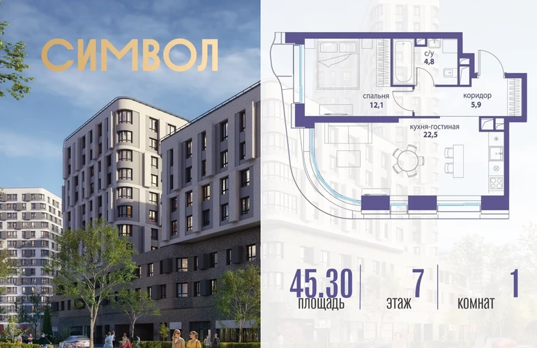 Продается 1-комнатная квартира от застройщика: общая площадь 45.30 м², жилая 12.10 м², кухня 22.50 м², 7-й этаж, жилой квартал «Вдохновение», корпус 34 (секция 1). Срок сдачи: 4 квартал 2027 года. Позвоните сейчас и забронируйте квартиру! Квартал бизнес-класса СИМВОЛ — это городское пространство нового поколения в историческом районе Лефортово, на границе ЦАО, в 2 км от Садового кольца. Бионическая архитектура СИМВОЛА превратила Лефортово в суперсовременное и модное пространство. Из окон, с балконов и террас просторных квартир СИМВОЛА открываются отличные виды на город и новый парк «Зеленая река», «протекающий» через все кварталы комплекса на 2 км. В квартале уже есть все, что нужно для комфортной жизни: кафе и рестораны, супермаркеты и магазины, медицинские и физкультурно-оздоровительные центры, салоны красоты и барбершопы, аптеки и оптики, химчистки, пункты доставки и другие сервисы — всего более 90 действующих объектов внутриквартальной инфраструктуры. Для юных жителей СИМВОЛА открыты детский сад и инженерный лицей при МГТУ им. Баумана. Особенности квартала: • Свой парк «Зеленая Река» - 10 га зелени и развлечений на любой вкус! • Уникальная для Москвы архитектура - Проект создан архитектурной мастерской ATRIUM по дизайн-коду британских бюро LDA Design и UHA London. • Богатая инфраструктура с детскими садами и лицеем им. Баумана, кафе и ресторанами, супермаркетами и аптеками, зоной для фитнеса, бассейном и мед. центром. • Квартиры с панорамными окнами, террасами, ванными с окнами и каминами редких форматов. • Закрытые безопасные зелёные дворы-парки без машин!О застройщике