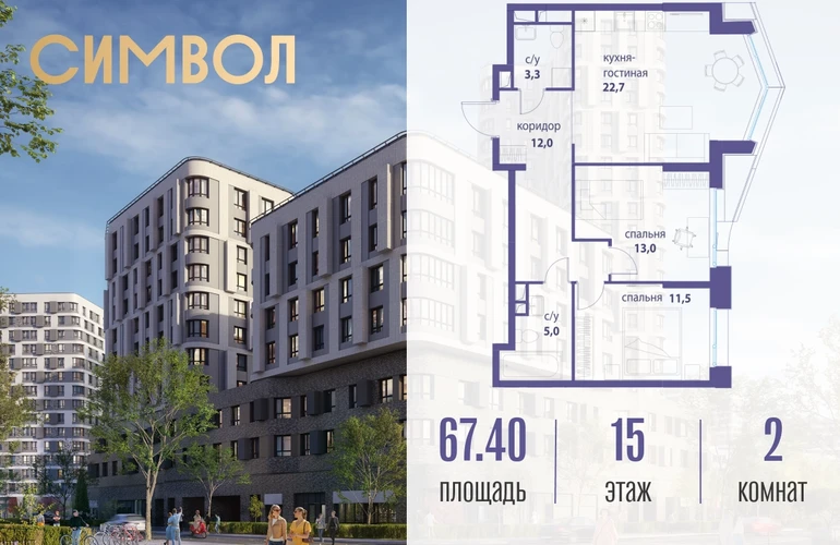 Продается 2-комнатная квартира от застройщика: общая площадь 67.40 м², жилая 24.50 м², кухня 22.70 м², 15-й этаж, жилой квартал «Вдохновение», корпус 32 (секция 1). Срок сдачи: 4 квартал 2027 года. Позвоните сейчас и забронируйте квартиру! Квартал бизнес-класса СИМВОЛ — это городское пространство нового поколения в историческом районе Лефортово, на границе ЦАО, в 2 км от Садового кольца. Бионическая архитектура СИМВОЛА превратила Лефортово в суперсовременное и модное пространство. Из окон, с балконов и террас просторных квартир СИМВОЛА открываются отличные виды на город и новый парк «Зеленая река», «протекающий» через все кварталы комплекса на 2 км. В квартале уже есть все, что нужно для комфортной жизни: кафе и рестораны, супермаркеты и магазины, медицинские и физкультурно-оздоровительные центры, салоны красоты и барбершопы, аптеки и оптики, химчистки, пункты доставки и другие сервисы — всего более 90 действующих объектов внутриквартальной инфраструктуры. Для юных жителей СИМВОЛА открыты детский сад и инженерный лицей при МГТУ им. Баумана. Особенности квартала: • Свой парк «Зеленая Река» - 10 га зелени и развлечений на любой вкус! • Уникальная для Москвы архитектура - Проект создан архитектурной мастерской ATRIUM по дизайн-коду британских бюро LDA Design и UHA London. • Богатая инфраструктура с детскими садами и лицеем им. Баумана, кафе и ресторанами, супермаркетами и аптеками, зоной для фитнеса, бассейном и мед. центром. • Квартиры с панорамными окнами, террасами, ванными с окнами и каминами редких форматов. • Закрытые безопасные зелёные дворы-парки без машин!О застройщике