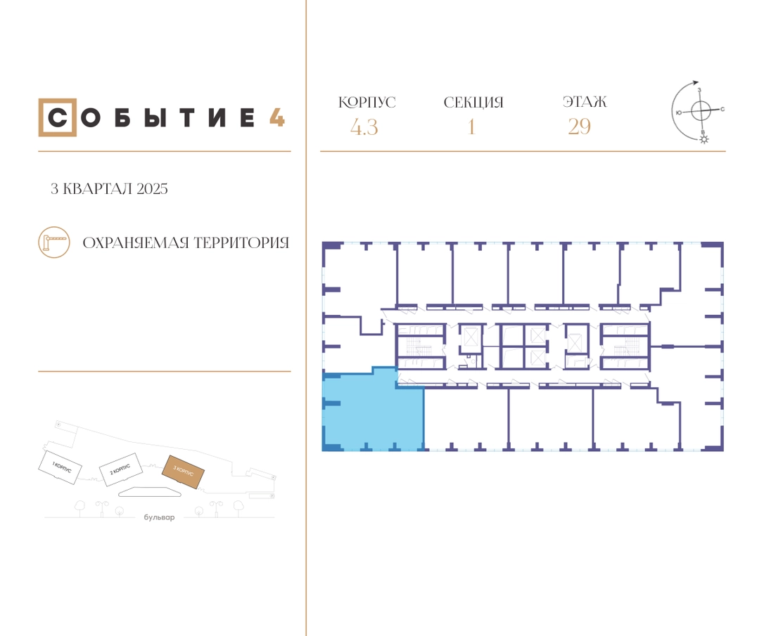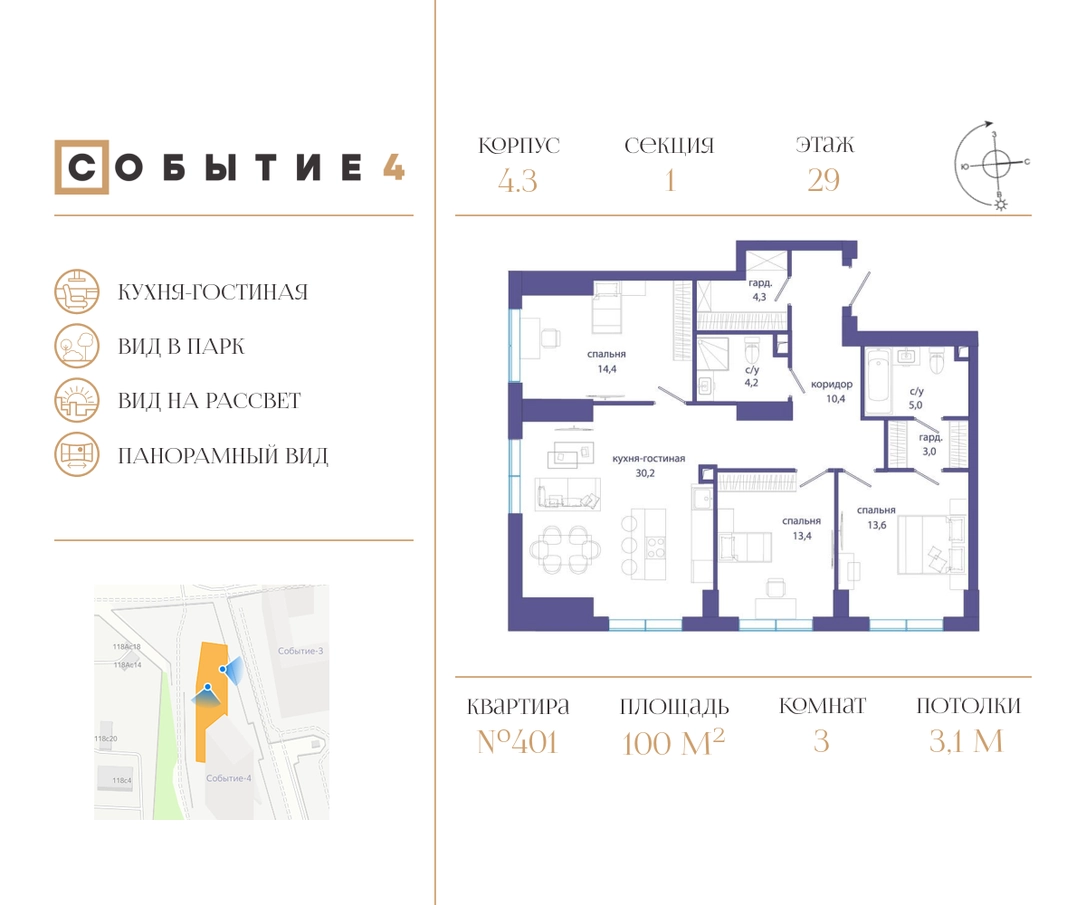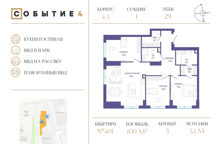 Продаётся 3-комнатная квартира от застройщика: общая площадь 100.00 м², жилая 41.40 м², кухня 30.20 м², 29-й этаж, жилой квартал «Событие-4», корпус 3 (секция 1) Срок сдачи: 3 квартал 2025 года. <br> <br>Действует большой выбор скидок и ипотечных программ: вы можете выбрать те, что подходят именно вам. <br> <br>Акции и рассрочка: <br>• Семейные квартиры в домах высокой степени готовности! <br>• Беспроцентная рассрочка! <br> <br>Позвоните сейчас и забронируйте квартиру! <br> <br>Продуманный до деталей. Созданный для жизни, полной счастливых событий. Парк-квартал СОБЫТИЕ — это жизнь класса премиум в престижном районе на Мосфильмовской улице. <br>Архитектура мирового уровня. Выигрышное расположение на границе природного комплекса «Долина реки Раменки». Все для комфортной жизни и досуга: от детсадов и школ до ресторанов и медцентров. И новая точка притяжения — уже готовый парк «Событие» с пространствами активности для всех возрастов и интересов. <br> <br>Особенности квартала: <br>• «Парящие» мосты и парк под облаками - уникальный дом с самыми завораживающими видами из окон «в пол» <br>• Собственный парк — сразу за порогом! <br>• Архитектурная концепция от известных международных бюро LDA Design и UHA London <br>• Инфраструктура «тапочной доступности»: в кафе, школу, магазин — за пару минут! <br>• Внутренний двор — настоящее продолжение вашего дома: закрытая охраняемая территория без машин, развивающие детские площадки, воркауты-зоны для тех, кто хочет быть в форме, площади для праздников и посиделок с соседями.О застройщике