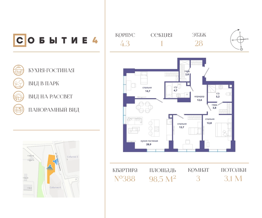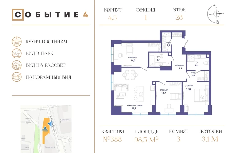 Продаётся 3-комнатная квартира от застройщика: общая площадь 98.50 м², жилая 40.20 м², кухня 28.90 м², 28-й этаж, жилой квартал «Событие-4», корпус 3 (секция 1) Срок сдачи: 3 квартал 2025 года. <br> <br>Действует большой выбор скидок и ипотечных программ: вы можете выбрать те, что подходят именно вам. <br> <br>Акции и рассрочка: <br>• Семейные квартиры в домах высокой степени готовности! <br>• Беспроцентная рассрочка! <br> <br>Позвоните сейчас и забронируйте квартиру! <br> <br>Продуманный до деталей. Созданный для жизни, полной счастливых событий. Парк-квартал СОБЫТИЕ — это жизнь класса премиум в престижном районе на Мосфильмовской улице. <br>Архитектура мирового уровня. Выигрышное расположение на границе природного комплекса «Долина реки Раменки». Все для комфортной жизни и досуга: от детсадов и школ до ресторанов и медцентров. И новая точка притяжения — уже готовый парк «Событие» с пространствами активности для всех возрастов и интересов. <br> <br>Особенности квартала: <br>• «Парящие» мосты и парк под облаками - уникальный дом с самыми завораживающими видами из окон «в пол» <br>• Собственный парк — сразу за порогом! <br>• Архитектурная концепция от известных международных бюро LDA Design и UHA London <br>• Инфраструктура «тапочной доступности»: в кафе, школу, магазин — за пару минут! <br>• Внутренний двор — настоящее продолжение вашего дома: закрытая охраняемая территория без машин, развивающие детские площадки, воркауты-зоны для тех, кто хочет быть в форме, площади для праздников и посиделок с соседями.О застройщике