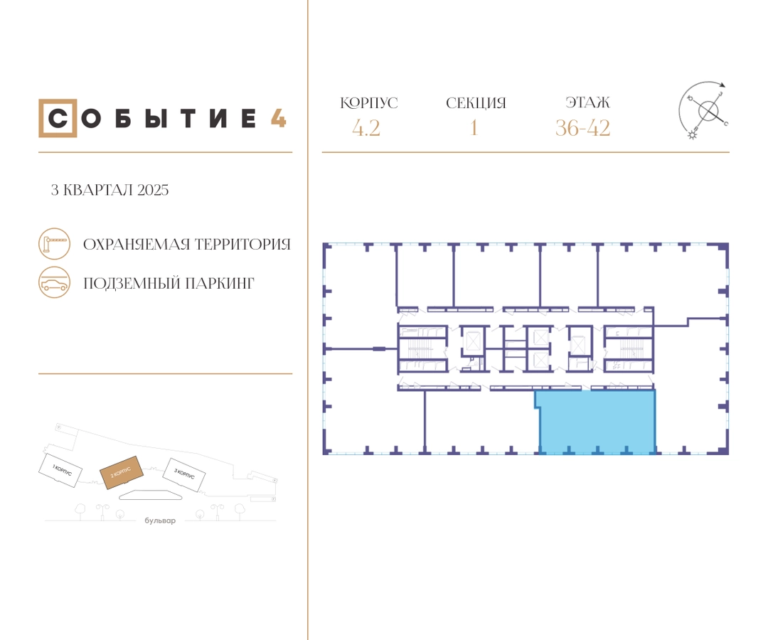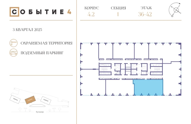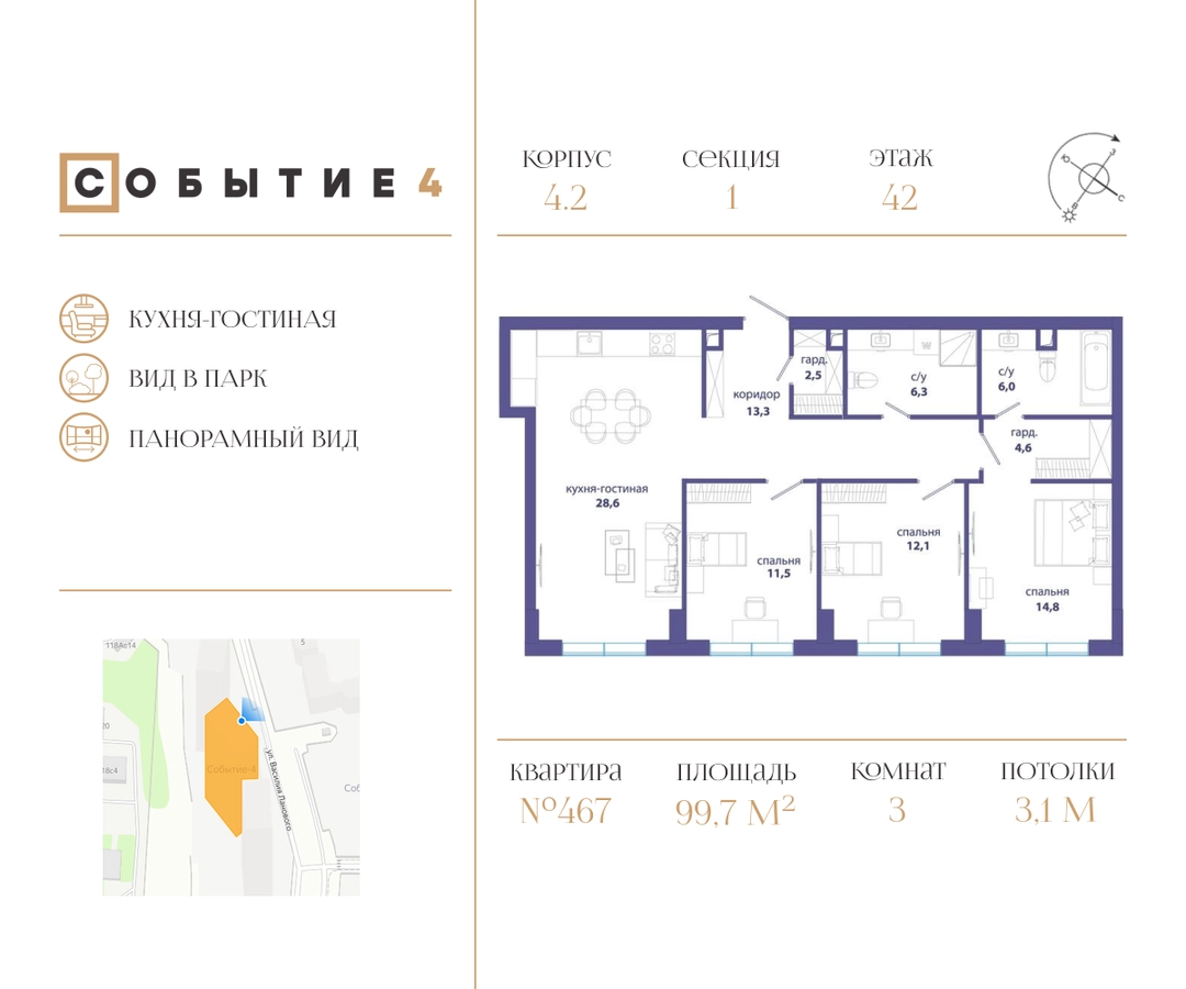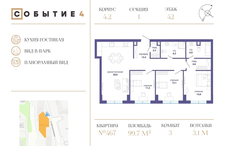 Продаётся 3-комнатная квартира от застройщика: общая площадь 99.70 м², жилая 38.40 м², кухня 28.60 м², 42-й этаж, жилой квартал «Событие-4», корпус 2 (секция 1) Срок сдачи: 3 квартал 2025 года. <br> <br>Действует большой выбор скидок и ипотечных программ: вы можете выбрать те, что подходят именно вам. <br> <br>Акции и рассрочка: <br>• Семейные квартиры в домах высокой степени готовности! <br>• Беспроцентная рассрочка! <br> <br>Позвоните сейчас и забронируйте квартиру! <br> <br>Продуманный до деталей. Созданный для жизни, полной счастливых событий. Парк-квартал СОБЫТИЕ — это жизнь класса премиум в престижном районе на Мосфильмовской улице. <br>Архитектура мирового уровня. Выигрышное расположение на границе природного комплекса «Долина реки Раменки». Все для комфортной жизни и досуга: от детсадов и школ до ресторанов и медцентров. И новая точка притяжения — уже готовый парк «Событие» с пространствами активности для всех возрастов и интересов. <br> <br>Особенности квартала: <br>• «Парящие» мосты и парк под облаками - уникальный дом с самыми завораживающими видами из окон «в пол» <br>• Собственный парк — сразу за порогом! <br>• Архитектурная концепция от известных международных бюро LDA Design и UHA London <br>• Инфраструктура «тапочной доступности»: в кафе, школу, магазин — за пару минут! <br>• Внутренний двор — настоящее продолжение вашего дома: закрытая охраняемая территория без машин, развивающие детские площадки, воркауты-зоны для тех, кто хочет быть в форме, площади для праздников и посиделок с соседями.О застройщике