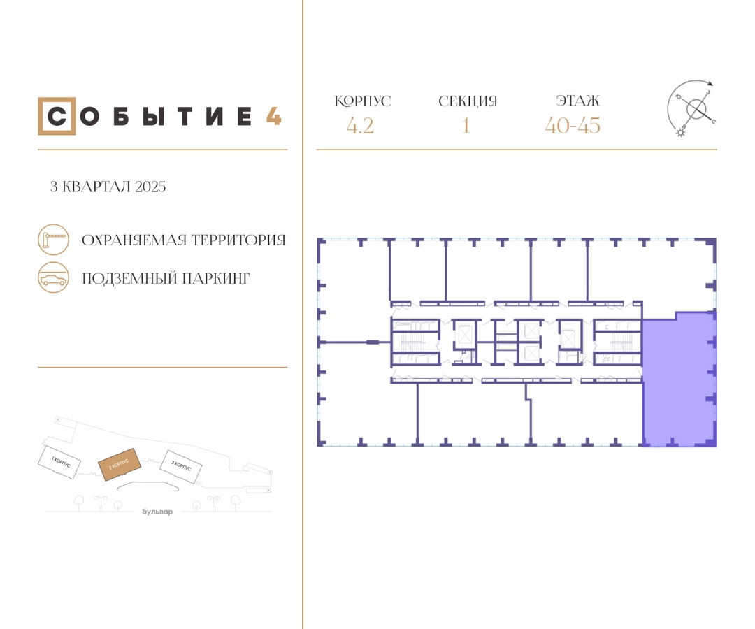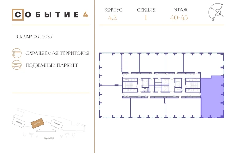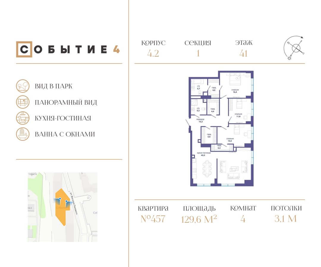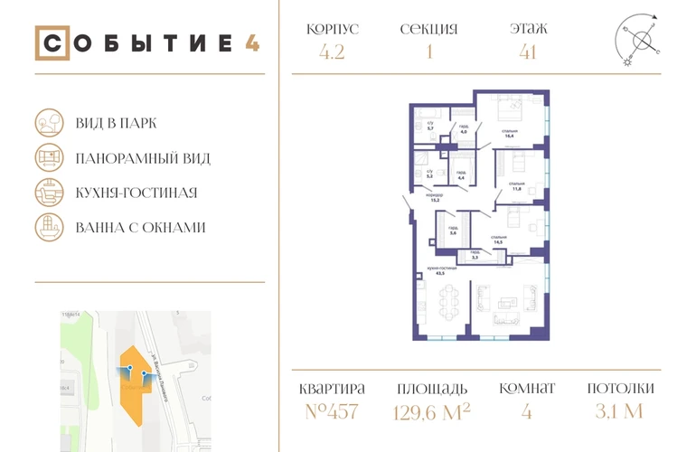 Продаётся 4-комнатная квартира от застройщика: общая площадь 129.60 м², жилая 42.70 м², кухня 43.50 м², 41-й этаж, жилой квартал «Событие-4», корпус 2 (секция 1) Срок сдачи: 3 квартал 2025 года. <br> <br>Действует большой выбор скидок и ипотечных программ: вы можете выбрать те, что подходят именно вам. <br> <br>Акции и рассрочка: <br>• Семейные квартиры в домах высокой степени готовности! <br>• Беспроцентная рассрочка! <br> <br>Позвоните сейчас и забронируйте квартиру! <br> <br>Продуманный до деталей. Созданный для жизни, полной счастливых событий. Парк-квартал СОБЫТИЕ — это жизнь класса премиум в престижном районе на Мосфильмовской улице. <br>Архитектура мирового уровня. Выигрышное расположение на границе природного комплекса «Долина реки Раменки». Все для комфортной жизни и досуга: от детсадов и школ до ресторанов и медцентров. И новая точка притяжения — уже готовый парк «Событие» с пространствами активности для всех возрастов и интересов. <br> <br>Особенности квартала: <br>• «Парящие» мосты и парк под облаками - уникальный дом с самыми завораживающими видами из окон «в пол» <br>• Собственный парк — сразу за порогом! <br>• Архитектурная концепция от известных международных бюро LDA Design и UHA London <br>• Инфраструктура «тапочной доступности»: в кафе, школу, магазин — за пару минут! <br>• Внутренний двор — настоящее продолжение вашего дома: закрытая охраняемая территория без машин, развивающие детские площадки, воркауты-зоны для тех, кто хочет быть в форме, площади для праздников и посиделок с соседями.О застройщике