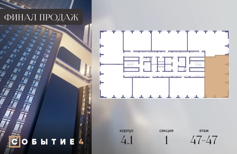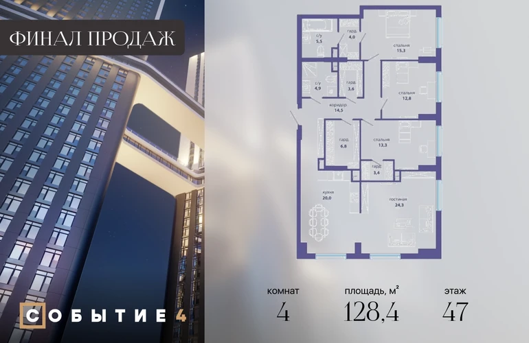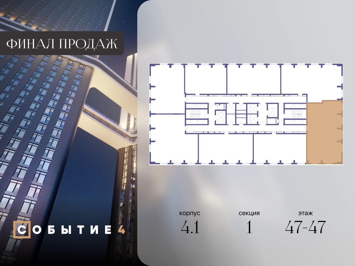 Продаётся 4-комнатная квартира от застройщика: общая площадь 128.40 м², жилая 65.70 м², кухня 20.00 м², 47-й этаж, жилой квартал «Событие-4», корпус 1 (секция 1) Срок сдачи: 2 квартал 2027 года. Действует большой выбор скидок и ипотечных программ: вы можете выбрать те, что подходят именно вам. Акции и рассрочка: • Семейные квартиры в домах высокой степени готовности! • Беспроцентная рассрочка! Позвоните сейчас и забронируйте квартиру! Продуманный до деталей. Созданный для жизни, полной счастливых событий. Парк-квартал СОБЫТИЕ — это жизнь класса премиум в престижном районе на Мосфильмовской улице. Архитектура мирового уровня. Выигрышное расположение на границе природного комплекса «Долина реки Раменки». Все для комфортной жизни и досуга: от детсадов и школ до ресторанов и медцентров. И новая точка притяжения — уже готовый парк «Событие» с пространствами активности для всех возрастов и интересов. Особенности квартала: • «Парящие» мосты и парк под облаками - уникальный дом с самыми завораживающими видами из окон «в пол» • Собственный парк — сразу за порогом! • Архитектурная концепция от известных международных бюро LDA Design и UHA London • Инфраструктура «тапочной доступности»: в кафе, школу, магазин — за пару минут! • Внутренний двор — настоящее продолжение вашего дома: закрытая охраняемая территория без машин, развивающие детские площадки, воркауты-зоны для тех, кто хочет быть в форме, площади для праздников и посиделок с соседями.О застройщике