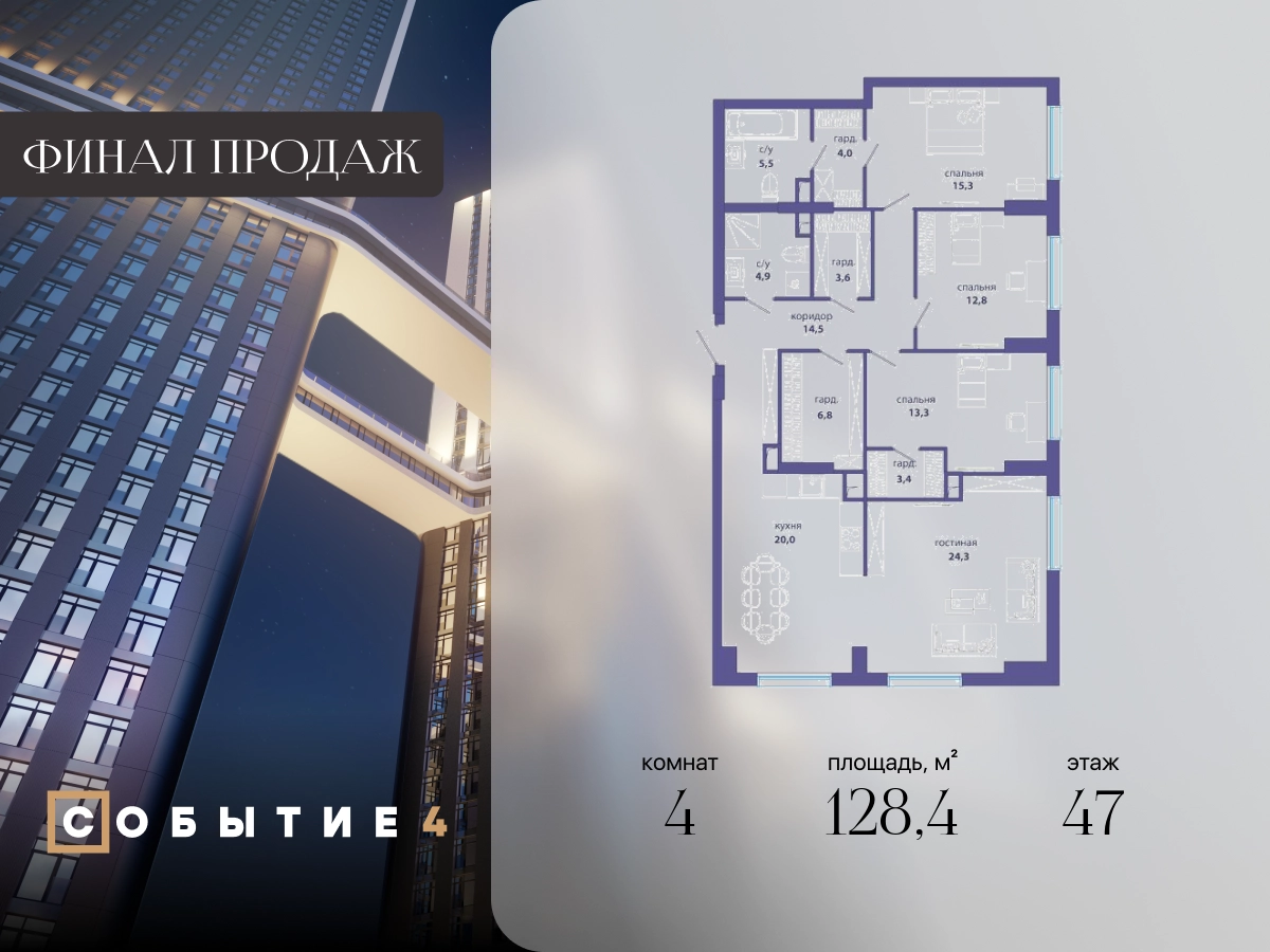 Продаётся 4-комнатная квартира от застройщика: общая площадь 128.40 м², жилая 65.70 м², кухня 20.00 м², 47-й этаж, жилой квартал «Событие-4», корпус 1 (секция 1) Срок сдачи: 1 квартал 2026 года. Позвоните сейчас и забронируйте квартиру! Продуманный до деталей. Созданный для жизни, полной счастливых событий. Парк-квартал СОБЫТИЕ — это жизнь класса премиум в престижном районе на Мосфильмовской улице. Архитектура мирового уровня. Выигрышное расположение на границе природного комплекса «Долина реки Раменки». Все для комфортной жизни и досуга: от детсадов и школ до ресторанов и медцентров. И новая точка притяжения — уже готовый парк «Событие» с пространствами активности для всех возрастов и интересов. Особенности квартала: • «Парящие» мосты и парк под облаками - уникальный дом с самыми завораживающими видами из окон «в пол» • Собственный парк — сразу за порогом! • Архитектурная концепция от известных международных бюро LDA Design и UHA London • Инфраструктура «тапочной доступности»: в кафе, школу, магазин — за пару минут! • Внутренний двор — настоящее продолжение вашего дома: закрытая охраняемая территория без машин, развивающие детские площадки, воркауты-зоны для тех, кто хочет быть в форме, площади для праздников и посиделок с соседями.О застройщике