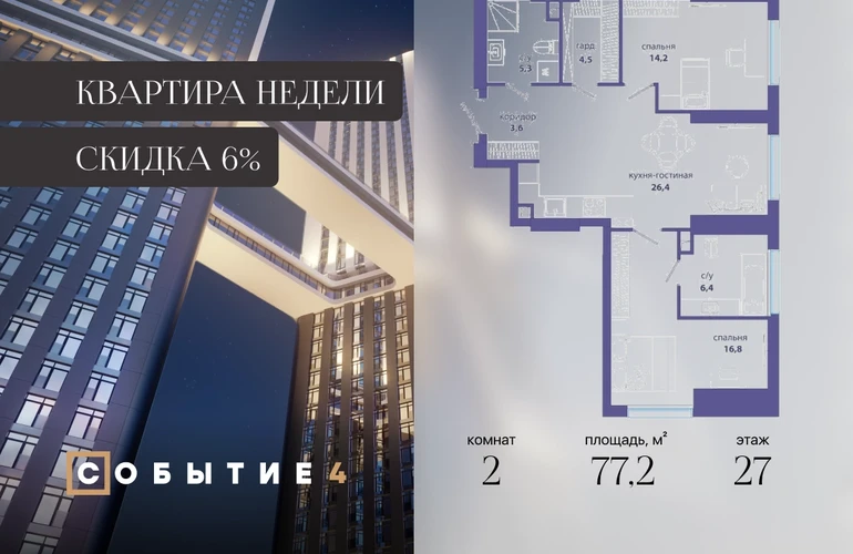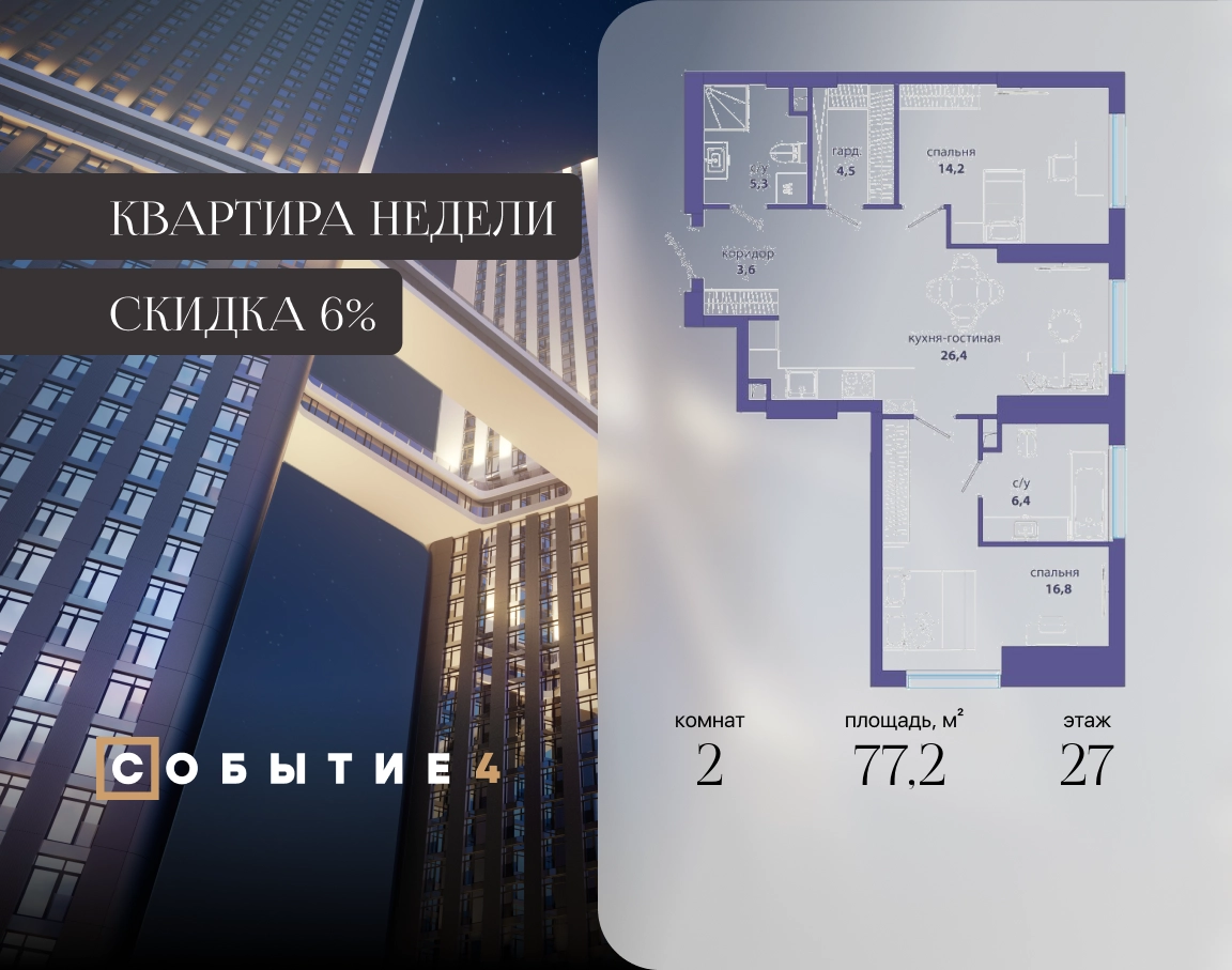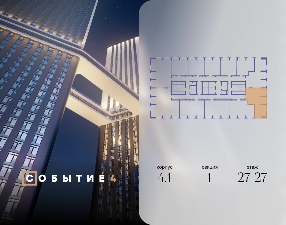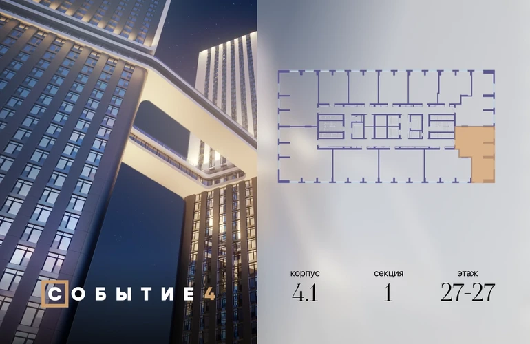 Продаётся 2-комнатная квартира от застройщика: общая площадь 77.20 м², жилая 31.00 м², кухня 26.40 м², 27-й этаж, жилой квартал «Событие-4», корпус 1 (секция 1) Срок сдачи: 1 квартал 2026 года. Позвоните сейчас и забронируйте квартиру! Продуманный до деталей. Созданный для жизни, полной счастливых событий. Парк-квартал СОБЫТИЕ — это жизнь класса премиум в престижном районе на Мосфильмовской улице. Архитектура мирового уровня. Выигрышное расположение на границе природного комплекса «Долина реки Раменки». Все для комфортной жизни и досуга: от детсадов и школ до ресторанов и медцентров. И новая точка притяжения — уже готовый парк «Событие» с пространствами активности для всех возрастов и интересов. Особенности квартала: • «Парящие» мосты и парк под облаками - уникальный дом с самыми завораживающими видами из окон «в пол» • Собственный парк — сразу за порогом! • Архитектурная концепция от известных международных бюро LDA Design и UHA London • Инфраструктура «тапочной доступности»: в кафе, школу, магазин — за пару минут! • Внутренний двор — настоящее продолжение вашего дома: закрытая охраняемая территория без машин, развивающие детские площадки, воркауты-зоны для тех, кто хочет быть в форме, площади для праздников и посиделок с соседями.О застройщике