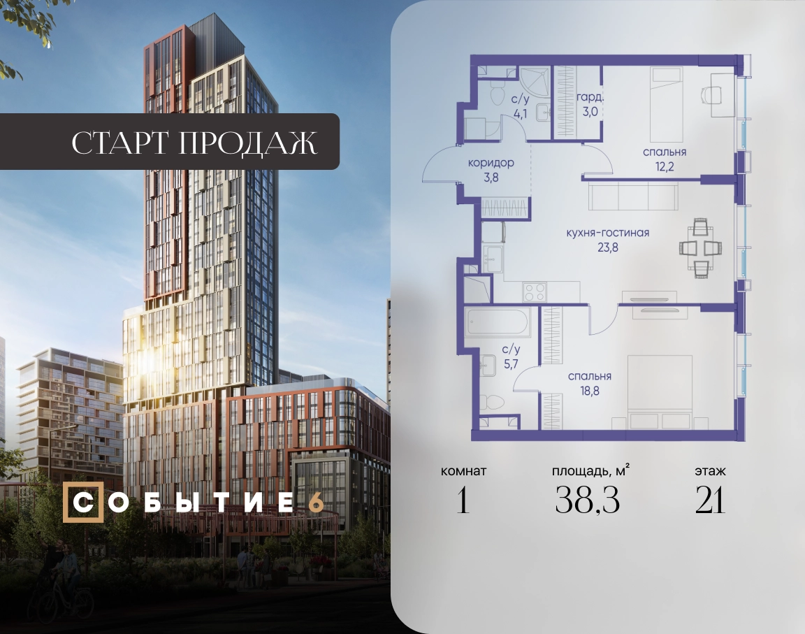 Продаётся 1-комнатная квартира от застройщика: общая площадь 38.30 м², жилая 14.60 м², кухня 15.70 м², 21-й этаж, жилой квартал «Событие-6», корпус 2 (секция 5) Срок сдачи: 1 квартал 2029 года. Позвоните сейчас и забронируйте квартиру! Продуманный до деталей. Созданный для жизни, полной счастливых событий. Парк-квартал СОБЫТИЕ — это жизнь класса премиум в престижном районе на Мосфильмовской улице. Архитектура мирового уровня. Выигрышное расположение на границе природного комплекса «Долина реки Раменки». Все для комфортной жизни и досуга: от детсадов и школ до ресторанов и медцентров. И новая точка притяжения — уже готовый парк «Событие» с пространствами активности для всех возрастов и интересов. Особенности квартала: • «Парящие» мосты и парк под облаками - уникальный дом с самыми завораживающими видами из окон «в пол» • Собственный парк — сразу за порогом! • Архитектурная концепция от известных международных бюро LDA Design и UHA London • Инфраструктура «тапочной доступности»: в кафе, школу, магазин — за пару минут! • Внутренний двор — настоящее продолжение вашего дома: закрытая охраняемая территория без машин, развивающие детские площадки, воркауты-зоны для тех, кто хочет быть в форме, площади для праздников и посиделок с соседями.О застройщике
