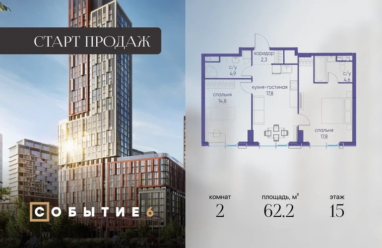 Продаётся 2-комнатная квартира от застройщика: общая площадь 62.20 м², жилая 32.60 м², кухня 17.80 м², 15-й этаж, жилой квартал «Событие-6», корпус 2 (секция 5) Срок сдачи: 1 квартал 2029 года. Позвоните сейчас и забронируйте квартиру! Продуманный до деталей. Созданный для жизни, полной счастливых событий. Парк-квартал СОБЫТИЕ — это жизнь класса премиум в престижном районе на Мосфильмовской улице. Архитектура мирового уровня. Выигрышное расположение на границе природного комплекса «Долина реки Раменки». Все для комфортной жизни и досуга: от детсадов и школ до ресторанов и медцентров. И новая точка притяжения — уже готовый парк «Событие» с пространствами активности для всех возрастов и интересов. Особенности квартала: • «Парящие» мосты и парк под облаками - уникальный дом с самыми завораживающими видами из окон «в пол» • Собственный парк — сразу за порогом! • Архитектурная концепция от известных международных бюро LDA Design и UHA London • Инфраструктура «тапочной доступности»: в кафе, школу, магазин — за пару минут! • Внутренний двор — настоящее продолжение вашего дома: закрытая охраняемая территория без машин, развивающие детские площадки, воркауты-зоны для тех, кто хочет быть в форме, площади для праздников и посиделок с соседями.О застройщике