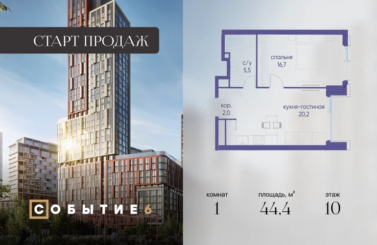 Продаётся 1-комнатная квартира от застройщика: общая площадь 44.40 м², жилая 16.70 м², кухня 20.20 м², 10-й этаж, жилой квартал «Событие-6», корпус 2 (секция 1) Срок сдачи: 1 квартал 2029 года. Позвоните сейчас и забронируйте квартиру! Продуманный до деталей. Созданный для жизни, полной счастливых событий. Парк-квартал СОБЫТИЕ — это жизнь класса премиум в престижном районе на Мосфильмовской улице. Архитектура мирового уровня. Выигрышное расположение на границе природного комплекса «Долина реки Раменки». Все для комфортной жизни и досуга: от детсадов и школ до ресторанов и медцентров. И новая точка притяжения — уже готовый парк «Событие» с пространствами активности для всех возрастов и интересов. Особенности квартала: • «Парящие» мосты и парк под облаками - уникальный дом с самыми завораживающими видами из окон «в пол» • Собственный парк — сразу за порогом! • Архитектурная концепция от известных международных бюро LDA Design и UHA London • Инфраструктура «тапочной доступности»: в кафе, школу, магазин — за пару минут! • Внутренний двор — настоящее продолжение вашего дома: закрытая охраняемая территория без машин, развивающие детские площадки, воркауты-зоны для тех, кто хочет быть в форме, площади для праздников и посиделок с соседями.О застройщике