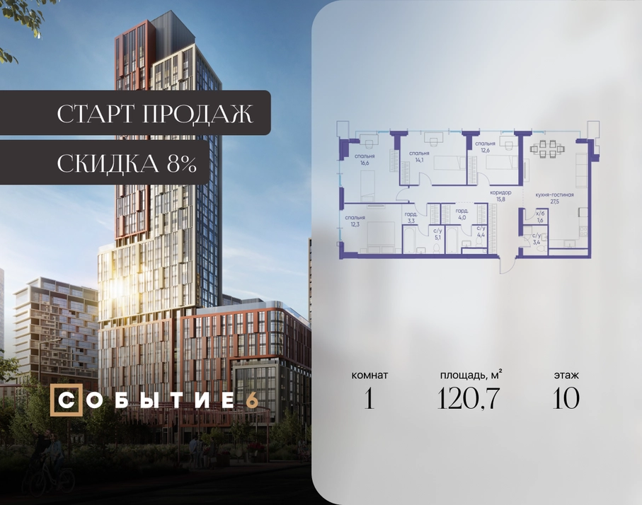 Продаётся 1-комнатная квартира от застройщика: общая площадь 120.70 м², жилая м², кухня м², 10-й этаж, жилой квартал «Событие-6», корпус 2 (секция 5) Срок сдачи: 1 квартал 2029 года. Позвоните сейчас и забронируйте квартиру! Продуманный до деталей. Созданный для жизни, полной счастливых событий. Парк-квартал СОБЫТИЕ — это жизнь класса премиум в престижном районе на Мосфильмовской улице. Архитектура мирового уровня. Выигрышное расположение на границе природного комплекса «Долина реки Раменки». Все для комфортной жизни и досуга: от детсадов и школ до ресторанов и медцентров. И новая точка притяжения — уже готовый парк «Событие» с пространствами активности для всех возрастов и интересов. Особенности квартала: • «Парящие» мосты и парк под облаками - уникальный дом с самыми завораживающими видами из окон «в пол» • Собственный парк — сразу за порогом! • Архитектурная концепция от известных международных бюро LDA Design и UHA London • Инфраструктура «тапочной доступности»: в кафе, школу, магазин — за пару минут! • Внутренний двор — настоящее продолжение вашего дома: закрытая охраняемая территория без машин, развивающие детские площадки, воркауты-зоны для тех, кто хочет быть в форме, площади для праздников и посиделок с соседями.О застройщике