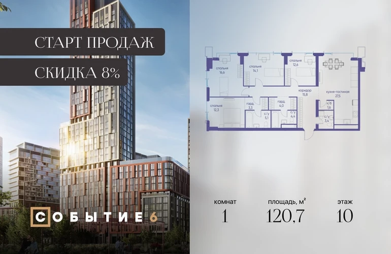 Продаётся 1-комнатная квартира от застройщика: общая площадь 120.70 м², жилая м², кухня м², 10-й этаж, жилой квартал «Событие-6», корпус 2 (секция 5) Срок сдачи: 1 квартал 2029 года. Позвоните сейчас и забронируйте квартиру! Продуманный до деталей. Созданный для жизни, полной счастливых событий. Парк-квартал СОБЫТИЕ — это жизнь класса премиум в престижном районе на Мосфильмовской улице. Архитектура мирового уровня. Выигрышное расположение на границе природного комплекса «Долина реки Раменки». Все для комфортной жизни и досуга: от детсадов и школ до ресторанов и медцентров. И новая точка притяжения — уже готовый парк «Событие» с пространствами активности для всех возрастов и интересов. Особенности квартала: • «Парящие» мосты и парк под облаками - уникальный дом с самыми завораживающими видами из окон «в пол» • Собственный парк — сразу за порогом! • Архитектурная концепция от известных международных бюро LDA Design и UHA London • Инфраструктура «тапочной доступности»: в кафе, школу, магазин — за пару минут! • Внутренний двор — настоящее продолжение вашего дома: закрытая охраняемая территория без машин, развивающие детские площадки, воркауты-зоны для тех, кто хочет быть в форме, площади для праздников и посиделок с соседями.О застройщике
