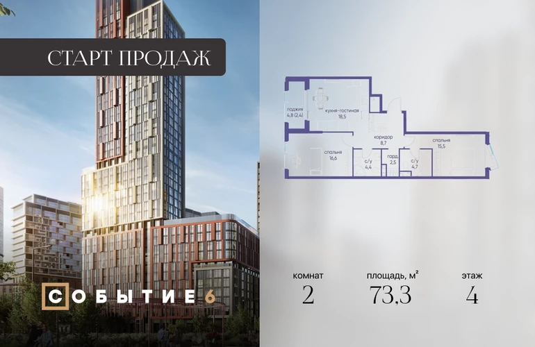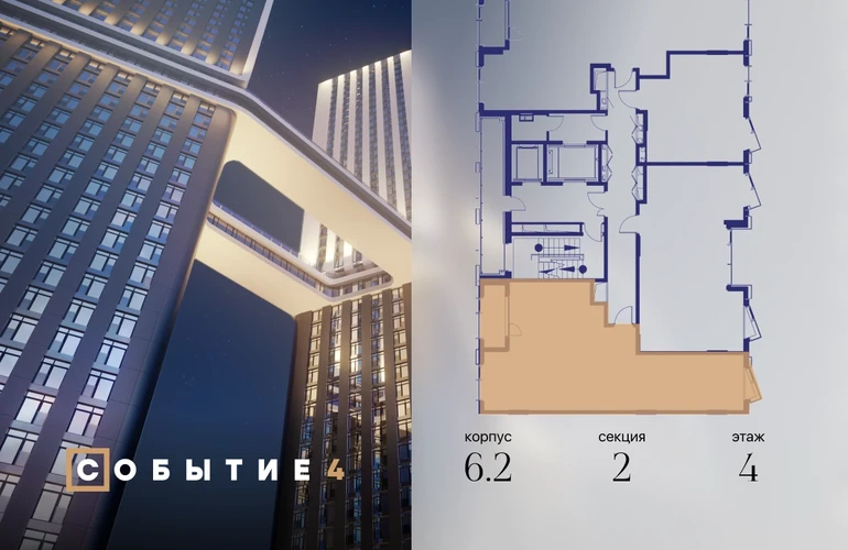 Продаётся 2-комнатная квартира от застройщика: общая площадь 73.30 м², жилая 32.10 м², кухня 18.50 м², 4-й этаж, жилой квартал «Событие-6», корпус 2 (секция 2) Срок сдачи: 1 квартал 2029 года. Позвоните сейчас и забронируйте квартиру! Продуманный до деталей. Созданный для жизни, полной счастливых событий. Парк-квартал СОБЫТИЕ — это жизнь класса премиум в престижном районе на Мосфильмовской улице. Архитектура мирового уровня. Выигрышное расположение на границе природного комплекса «Долина реки Раменки». Все для комфортной жизни и досуга: от детсадов и школ до ресторанов и медцентров. И новая точка притяжения — уже готовый парк «Событие» с пространствами активности для всех возрастов и интересов. Особенности квартала: • «Парящие» мосты и парк под облаками - уникальный дом с самыми завораживающими видами из окон «в пол» • Собственный парк — сразу за порогом! • Архитектурная концепция от известных международных бюро LDA Design и UHA London • Инфраструктура «тапочной доступности»: в кафе, школу, магазин — за пару минут! • Внутренний двор — настоящее продолжение вашего дома: закрытая охраняемая территория без машин, развивающие детские площадки, воркауты-зоны для тех, кто хочет быть в форме, площади для праздников и посиделок с соседями.О застройщике
