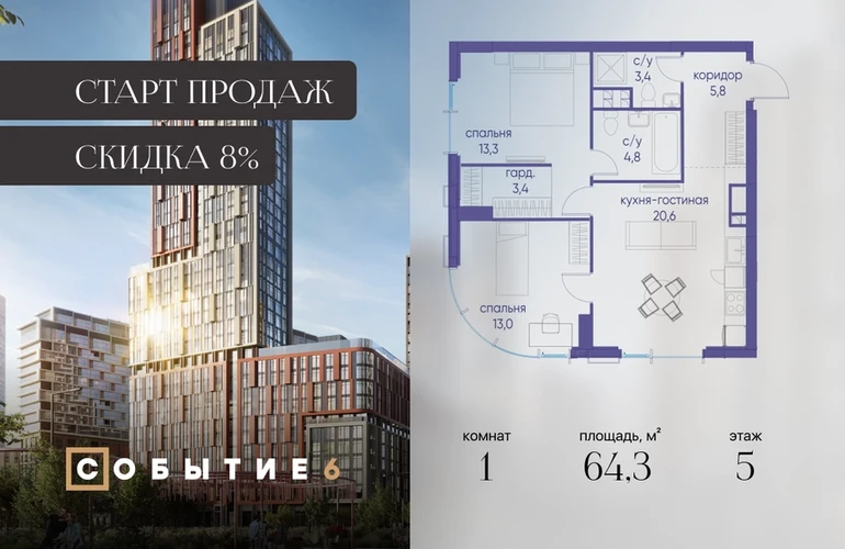 Продаётся 1-комнатная квартира от застройщика: общая площадь 64.30 м², жилая м², кухня м², 5-й этаж, жилой квартал «Событие-6», корпус 2 (секция 5) Срок сдачи: 1 квартал 2029 года. Позвоните сейчас и забронируйте квартиру! Продуманный до деталей. Созданный для жизни, полной счастливых событий. Парк-квартал СОБЫТИЕ — это жизнь класса премиум в престижном районе на Мосфильмовской улице. Архитектура мирового уровня. Выигрышное расположение на границе природного комплекса «Долина реки Раменки». Все для комфортной жизни и досуга: от детсадов и школ до ресторанов и медцентров. И новая точка притяжения — уже готовый парк «Событие» с пространствами активности для всех возрастов и интересов. Особенности квартала: • «Парящие» мосты и парк под облаками - уникальный дом с самыми завораживающими видами из окон «в пол» • Собственный парк — сразу за порогом! • Архитектурная концепция от известных международных бюро LDA Design и UHA London • Инфраструктура «тапочной доступности»: в кафе, школу, магазин — за пару минут! • Внутренний двор — настоящее продолжение вашего дома: закрытая охраняемая территория без машин, развивающие детские площадки, воркауты-зоны для тех, кто хочет быть в форме, площади для праздников и посиделок с соседями.О застройщике