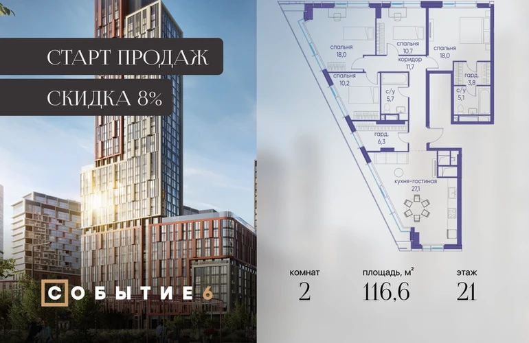 Продаётся 2-комнатная квартира от застройщика: общая площадь 116.60 м², жилая м², кухня м², 21-й этаж, жилой квартал «Событие-6», корпус 2 (секция 5) Срок сдачи: 1 квартал 2029 года. Позвоните сейчас и забронируйте квартиру! Продуманный до деталей. Созданный для жизни, полной счастливых событий. Парк-квартал СОБЫТИЕ — это жизнь класса премиум в престижном районе на Мосфильмовской улице. Архитектура мирового уровня. Выигрышное расположение на границе природного комплекса «Долина реки Раменки». Все для комфортной жизни и досуга: от детсадов и школ до ресторанов и медцентров. И новая точка притяжения — уже готовый парк «Событие» с пространствами активности для всех возрастов и интересов. Особенности квартала: • «Парящие» мосты и парк под облаками - уникальный дом с самыми завораживающими видами из окон «в пол» • Собственный парк — сразу за порогом! • Архитектурная концепция от известных международных бюро LDA Design и UHA London • Инфраструктура «тапочной доступности»: в кафе, школу, магазин — за пару минут! • Внутренний двор — настоящее продолжение вашего дома: закрытая охраняемая территория без машин, развивающие детские площадки, воркауты-зоны для тех, кто хочет быть в форме, площади для праздников и посиделок с соседями.