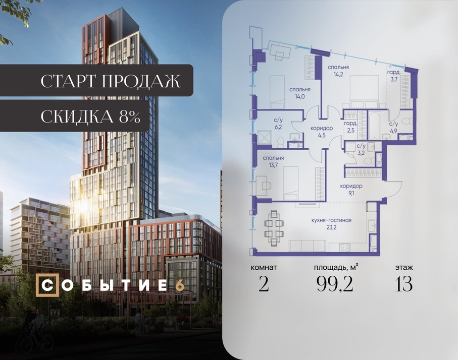 Продаётся 2-комнатная квартира от застройщика: общая площадь 99.20 м², жилая м², кухня м², 13-й этаж, жилой квартал «Событие-6», корпус 2 (секция 1) Срок сдачи: 1 квартал 2029 года. Позвоните сейчас и забронируйте квартиру! Продуманный до деталей. Созданный для жизни, полной счастливых событий. Парк-квартал СОБЫТИЕ — это жизнь класса премиум в престижном районе на Мосфильмовской улице. Архитектура мирового уровня. Выигрышное расположение на границе природного комплекса «Долина реки Раменки». Все для комфортной жизни и досуга: от детсадов и школ до ресторанов и медцентров. И новая точка притяжения — уже готовый парк «Событие» с пространствами активности для всех возрастов и интересов. Особенности квартала: • «Парящие» мосты и парк под облаками - уникальный дом с самыми завораживающими видами из окон «в пол» • Собственный парк — сразу за порогом! • Архитектурная концепция от известных международных бюро LDA Design и UHA London • Инфраструктура «тапочной доступности»: в кафе, школу, магазин — за пару минут! • Внутренний двор — настоящее продолжение вашего дома: закрытая охраняемая территория без машин, развивающие детские площадки, воркауты-зоны для тех, кто хочет быть в форме, площади для праздников и посиделок с соседями.О застройщике