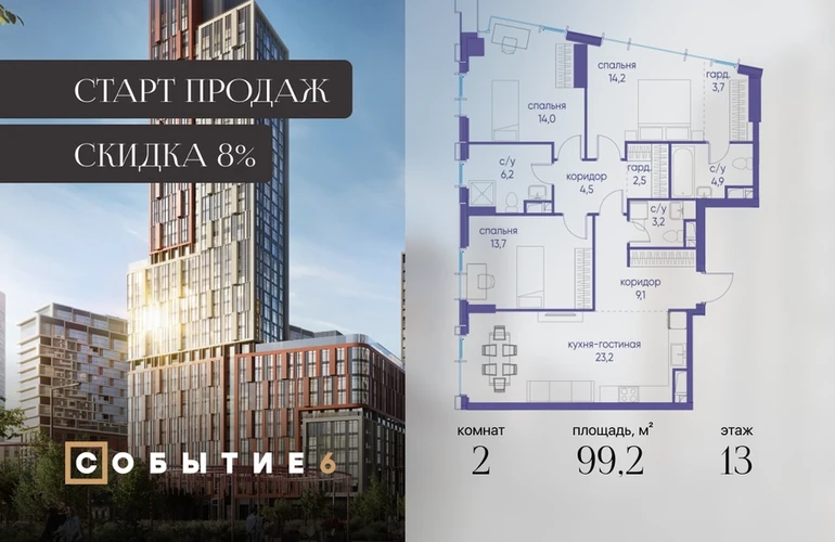 Продаётся 2-комнатная квартира от застройщика: общая площадь 99.20 м², жилая м², кухня м², 13-й этаж, жилой квартал «Событие-6», корпус 2 (секция 1) Срок сдачи: 1 квартал 2029 года. Позвоните сейчас и забронируйте квартиру! Продуманный до деталей. Созданный для жизни, полной счастливых событий. Парк-квартал СОБЫТИЕ — это жизнь класса премиум в престижном районе на Мосфильмовской улице. Архитектура мирового уровня. Выигрышное расположение на границе природного комплекса «Долина реки Раменки». Все для комфортной жизни и досуга: от детсадов и школ до ресторанов и медцентров. И новая точка притяжения — уже готовый парк «Событие» с пространствами активности для всех возрастов и интересов. Особенности квартала: • «Парящие» мосты и парк под облаками - уникальный дом с самыми завораживающими видами из окон «в пол» • Собственный парк — сразу за порогом! • Архитектурная концепция от известных международных бюро LDA Design и UHA London • Инфраструктура «тапочной доступности»: в кафе, школу, магазин — за пару минут! • Внутренний двор — настоящее продолжение вашего дома: закрытая охраняемая территория без машин, развивающие детские площадки, воркауты-зоны для тех, кто хочет быть в форме, площади для праздников и посиделок с соседями.О застройщике