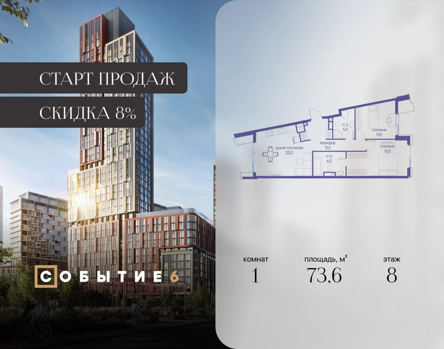 Продаётся 1-комнатная квартира от застройщика: общая площадь 73.60 м², жилая м², кухня м², 8-й этаж, жилой квартал «Событие-6», корпус 2 (секция 1) Срок сдачи: 1 квартал 2029 года. Позвоните сейчас и забронируйте квартиру! Продуманный до деталей. Созданный для жизни, полной счастливых событий. Парк-квартал СОБЫТИЕ — это жизнь класса премиум в престижном районе на Мосфильмовской улице. Архитектура мирового уровня. Выигрышное расположение на границе природного комплекса «Долина реки Раменки». Все для комфортной жизни и досуга: от детсадов и школ до ресторанов и медцентров. И новая точка притяжения — уже готовый парк «Событие» с пространствами активности для всех возрастов и интересов. Особенности квартала: • «Парящие» мосты и парк под облаками - уникальный дом с самыми завораживающими видами из окон «в пол» • Собственный парк — сразу за порогом! • Архитектурная концепция от известных международных бюро LDA Design и UHA London • Инфраструктура «тапочной доступности»: в кафе, школу, магазин — за пару минут! • Внутренний двор — настоящее продолжение вашего дома: закрытая охраняемая территория без машин, развивающие детские площадки, воркауты-зоны для тех, кто хочет быть в форме, площади для праздников и посиделок с соседями.О застройщике