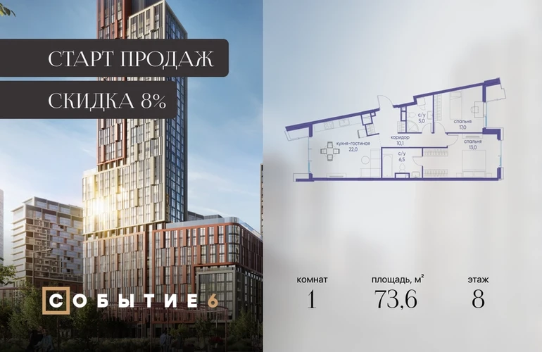 Продаётся 1-комнатная квартира от застройщика: общая площадь 73.60 м², жилая м², кухня м², 8-й этаж, жилой квартал «Событие-6», корпус 2 (секция 1) Срок сдачи: 1 квартал 2029 года. Позвоните сейчас и забронируйте квартиру! Продуманный до деталей. Созданный для жизни, полной счастливых событий. Парк-квартал СОБЫТИЕ — это жизнь класса премиум в престижном районе на Мосфильмовской улице. Архитектура мирового уровня. Выигрышное расположение на границе природного комплекса «Долина реки Раменки». Все для комфортной жизни и досуга: от детсадов и школ до ресторанов и медцентров. И новая точка притяжения — уже готовый парк «Событие» с пространствами активности для всех возрастов и интересов. Особенности квартала: • «Парящие» мосты и парк под облаками - уникальный дом с самыми завораживающими видами из окон «в пол» • Собственный парк — сразу за порогом! • Архитектурная концепция от известных международных бюро LDA Design и UHA London • Инфраструктура «тапочной доступности»: в кафе, школу, магазин — за пару минут! • Внутренний двор — настоящее продолжение вашего дома: закрытая охраняемая территория без машин, развивающие детские площадки, воркауты-зоны для тех, кто хочет быть в форме, площади для праздников и посиделок с соседями.О застройщике