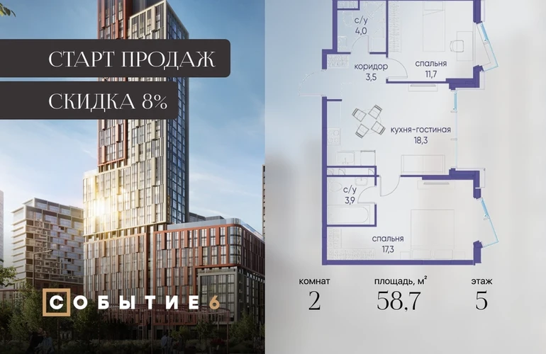 Продаётся 2-комнатная квартира от застройщика: общая площадь 58.70 м², жилая 29.00 м², кухня 18.30 м², 5-й этаж, жилой квартал «Событие-6», корпус 2 (секция 2) Срок сдачи: 1 квартал 2029 года. Позвоните сейчас и забронируйте квартиру! Продуманный до деталей. Созданный для жизни, полной счастливых событий. Парк-квартал СОБЫТИЕ — это жизнь класса премиум в престижном районе на Мосфильмовской улице. Архитектура мирового уровня. Выигрышное расположение на границе природного комплекса «Долина реки Раменки». Все для комфортной жизни и досуга: от детсадов и школ до ресторанов и медцентров. И новая точка притяжения — уже готовый парк «Событие» с пространствами активности для всех возрастов и интересов. Особенности квартала: • «Парящие» мосты и парк под облаками - уникальный дом с самыми завораживающими видами из окон «в пол» • Собственный парк — сразу за порогом! • Архитектурная концепция от известных международных бюро LDA Design и UHA London • Инфраструктура «тапочной доступности»: в кафе, школу, магазин — за пару минут! • Внутренний двор — настоящее продолжение вашего дома: закрытая охраняемая территория без машин, развивающие детские площадки, воркауты-зоны для тех, кто хочет быть в форме, площади для праздников и посиделок с соседями.