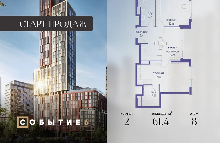 Продаётся 2-комнатная квартира от застройщика: общая площадь 61.40 м², жилая 31.60 м², кухня 16.90 м², 8-й этаж, жилой квартал «Событие-6», корпус 2 (секция 3) Срок сдачи: 1 квартал 2029 года. Позвоните сейчас и забронируйте квартиру! Продуманный до деталей. Созданный для жизни, полной счастливых событий. Парк-квартал СОБЫТИЕ — это жизнь класса премиум в престижном районе на Мосфильмовской улице. Архитектура мирового уровня. Выигрышное расположение на границе природного комплекса «Долина реки Раменки». Все для комфортной жизни и досуга: от детсадов и школ до ресторанов и медцентров. И новая точка притяжения — уже готовый парк «Событие» с пространствами активности для всех возрастов и интересов. Особенности квартала: • «Парящие» мосты и парк под облаками - уникальный дом с самыми завораживающими видами из окон «в пол» • Собственный парк — сразу за порогом! • Архитектурная концепция от известных международных бюро LDA Design и UHA London • Инфраструктура «тапочной доступности»: в кафе, школу, магазин — за пару минут! • Внутренний двор — настоящее продолжение вашего дома: закрытая охраняемая территория без машин, развивающие детские площадки, воркауты-зоны для тех, кто хочет быть в форме, площади для праздников и посиделок с соседями.О застройщике