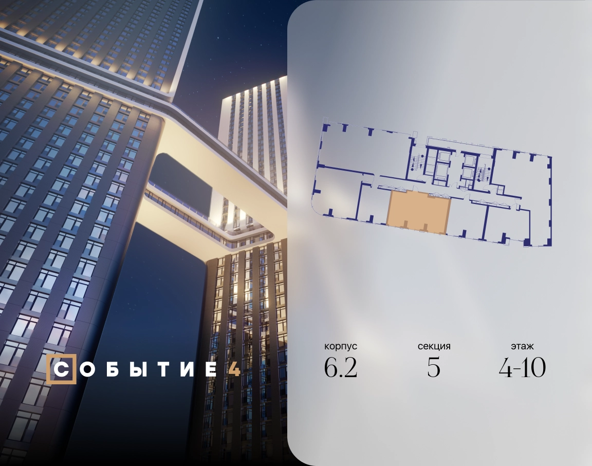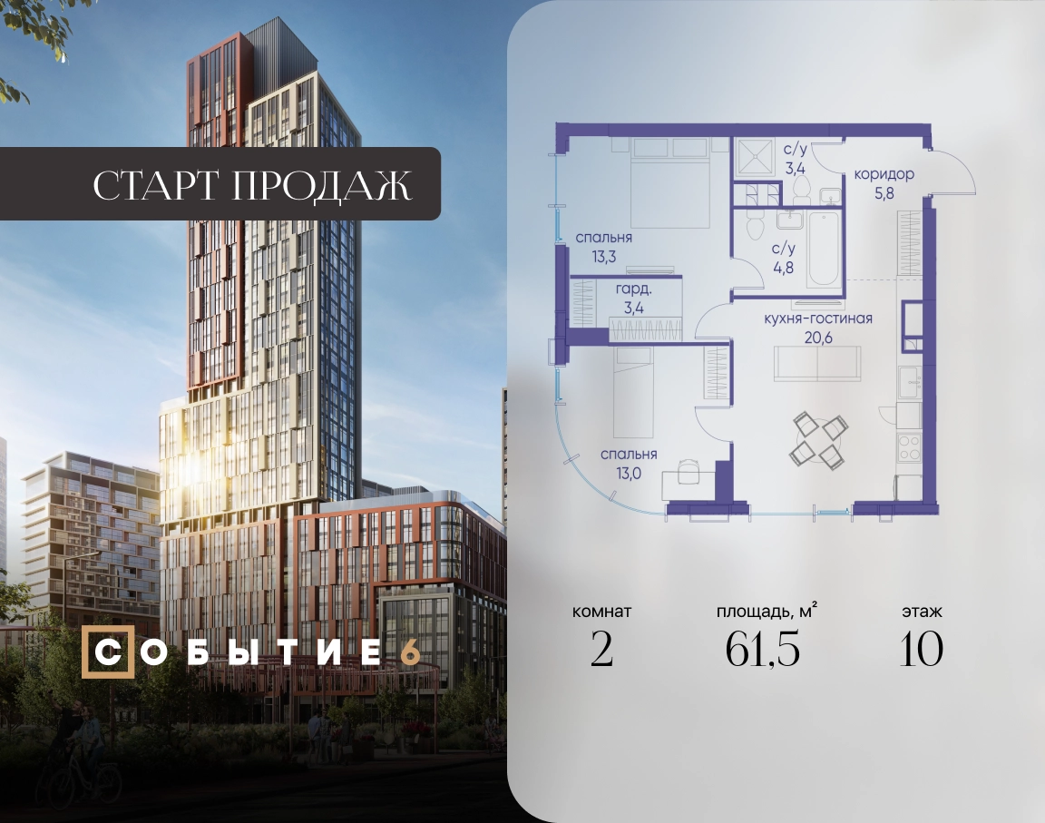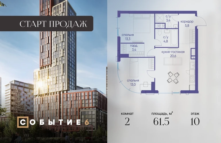 Продаётся 2-комнатная квартира от застройщика: общая площадь 61.50 м², жилая 32.00 м², кухня 17.80 м², 10-й этаж, жилой квартал «Событие-6», корпус 2 (секция 5) Срок сдачи: 1 квартал 2029 года. Позвоните сейчас и забронируйте квартиру! Продуманный до деталей. Созданный для жизни, полной счастливых событий. Парк-квартал СОБЫТИЕ — это жизнь класса премиум в престижном районе на Мосфильмовской улице. Архитектура мирового уровня. Выигрышное расположение на границе природного комплекса «Долина реки Раменки». Все для комфортной жизни и досуга: от детсадов и школ до ресторанов и медцентров. И новая точка притяжения — уже готовый парк «Событие» с пространствами активности для всех возрастов и интересов. Особенности квартала: • «Парящие» мосты и парк под облаками - уникальный дом с самыми завораживающими видами из окон «в пол» • Собственный парк — сразу за порогом! • Архитектурная концепция от известных международных бюро LDA Design и UHA London • Инфраструктура «тапочной доступности»: в кафе, школу, магазин — за пару минут! • Внутренний двор — настоящее продолжение вашего дома: закрытая охраняемая территория без машин, развивающие детские площадки, воркауты-зоны для тех, кто хочет быть в форме, площади для праздников и посиделок с соседями.О застройщике