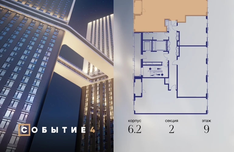 Продаётся 2-комнатная квартира от застройщика: общая площадь 70.90 м², жилая 30.30 м², кухня 21.80 м², 9-й этаж, жилой квартал «Событие-6», корпус 2 (секция 2) Срок сдачи: 1 квартал 2029 года. Позвоните сейчас и забронируйте квартиру! Продуманный до деталей. Созданный для жизни, полной счастливых событий. Парк-квартал СОБЫТИЕ — это жизнь класса премиум в престижном районе на Мосфильмовской улице. Архитектура мирового уровня. Выигрышное расположение на границе природного комплекса «Долина реки Раменки». Все для комфортной жизни и досуга: от детсадов и школ до ресторанов и медцентров. И новая точка притяжения — уже готовый парк «Событие» с пространствами активности для всех возрастов и интересов. Особенности квартала: • «Парящие» мосты и парк под облаками - уникальный дом с самыми завораживающими видами из окон «в пол» • Собственный парк — сразу за порогом! • Архитектурная концепция от известных международных бюро LDA Design и UHA London • Инфраструктура «тапочной доступности»: в кафе, школу, магазин — за пару минут! • Внутренний двор — настоящее продолжение вашего дома: закрытая охраняемая территория без машин, развивающие детские площадки, воркауты-зоны для тех, кто хочет быть в форме, площади для праздников и посиделок с соседями.О застройщике